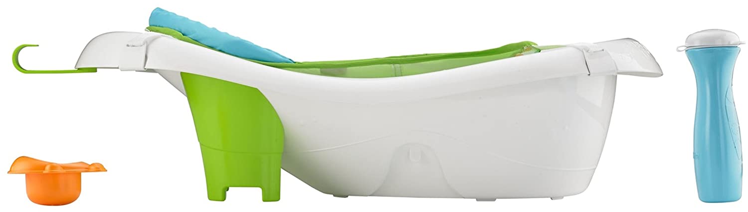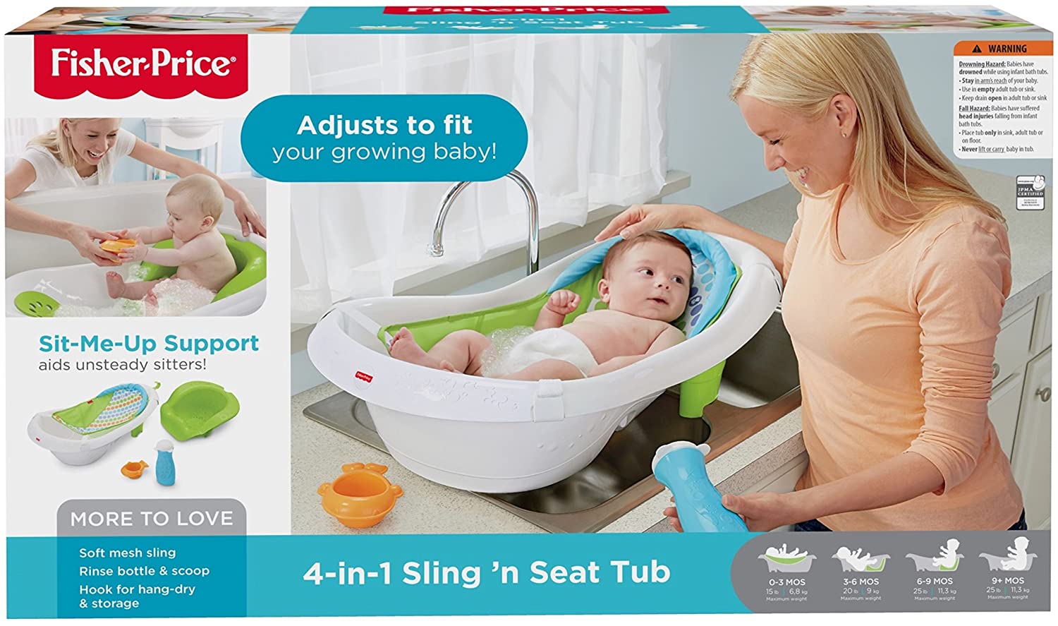The 4-in-1 Sling 'n Seat Tub from Fisher-Price adjusts to fit your baby from newborn, to infant, to toddler, to keep your growing little stinker safe and comfortable as they get squeaky clean. With removable features like a soft newborn sling, an infant support insert, and fun bath time toys, this convertible tub adapts to your baby's changing needs at every stage!