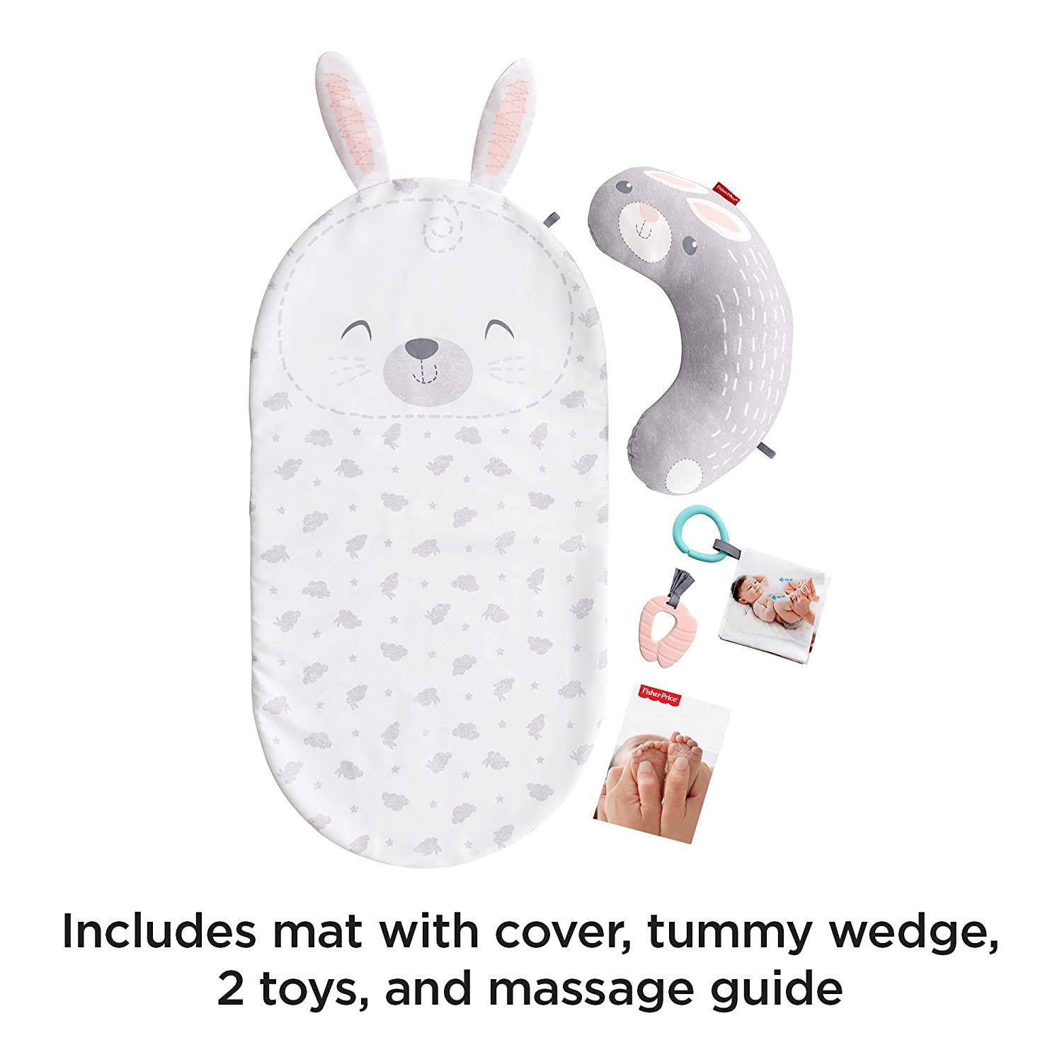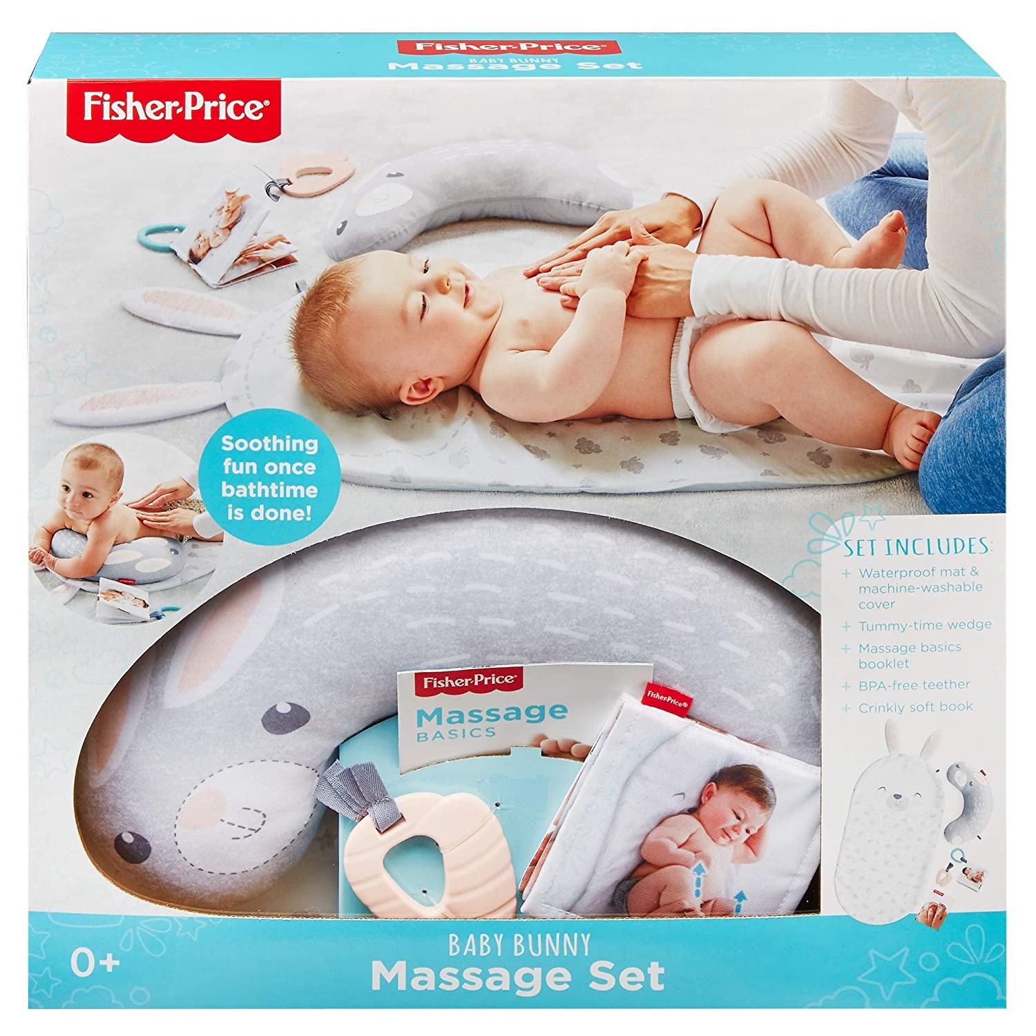 The FisherPrice Baby Bunny Massage Set has everything for a soothing, postbath time massage session with your baby. The waterproof mat is a comfy (and adorable) spot for your newborn to lie down and relax, and it doubles as a convenient changing pad with a machinewashable cover. The sweet bunny wedge is perfect for tummytime play and helps support your baby during ohsorelaxing back rubs. The set includes a guide to help you through the basics of baby massage, as well as a crinkly book and chewy carrot teether for playtime. Where development comes into play Sensory: The supersoft fabrics, crinkly book, and chewy teething toy all help engage your baby's developing tactile and auditory senses, as well as encourage teething. Security & Happiness: A soothing massage sesh with you and their soft bunny pal helps your baby feel calm and happy. Healthy Habits: This convenient massage set helps make postbath time bonding part of your daily routine and helps soothe your baby before bed.