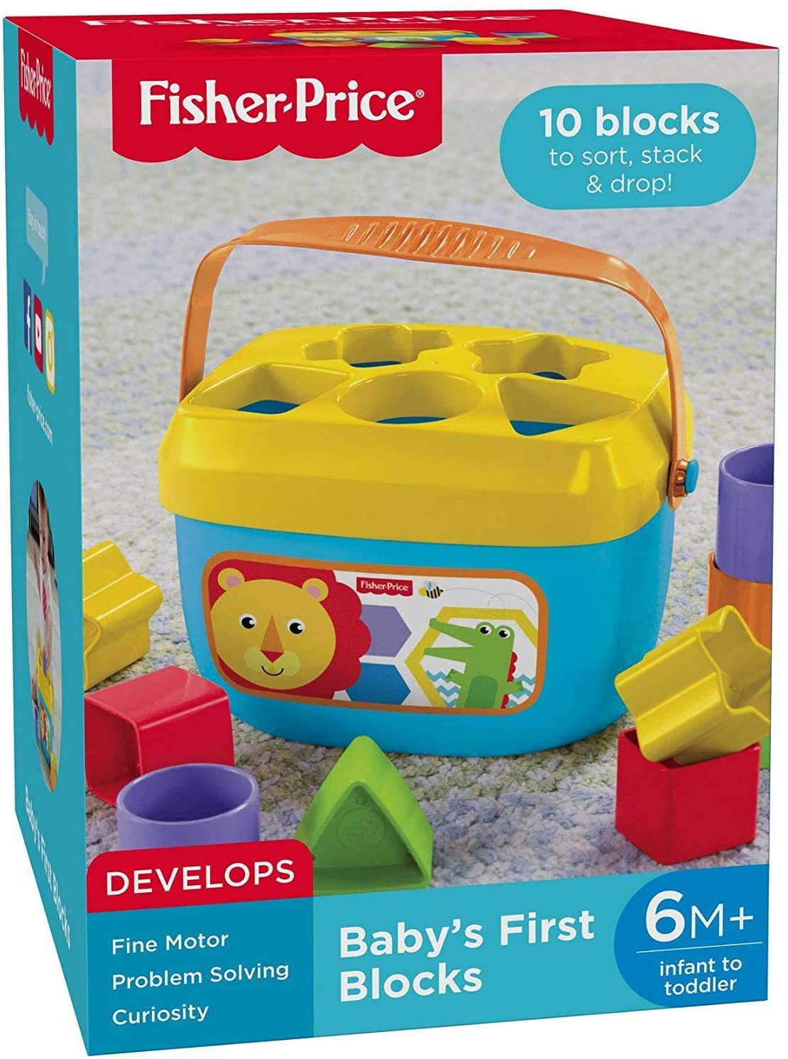 Open a bucket of fun for your little one with Baby's First Blocks. These chunky, colorful blocks help introduce colors and shapes as babies sort, stack and drop the blocks through the slots in the bucket lid. Empty the bucket to start the fun over again and again; And with an easy carry handle, you can take Baby's First Blocks wherever you and your tiny tot go; Where development comes into play; Fine Motor: All that block grasping and put & take play helps strengthen your baby's hand eye coordination and dexterity. Problem Solving: Babies will exercise their problem solving skills as they figure out how to sort & drop the blocks in the correct spots. Curiosity: As little ones learn how to sort the shapes on their own and practice filling ( & spilling!) over and over, their confidence and sense of independence is strengthened.
