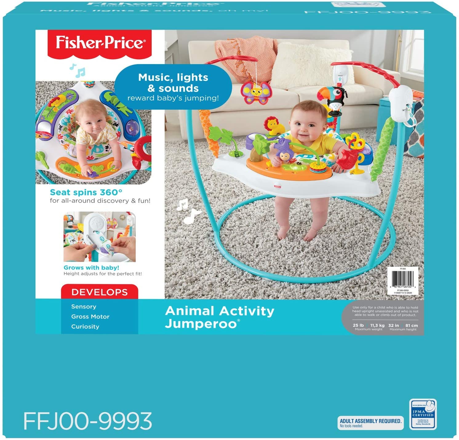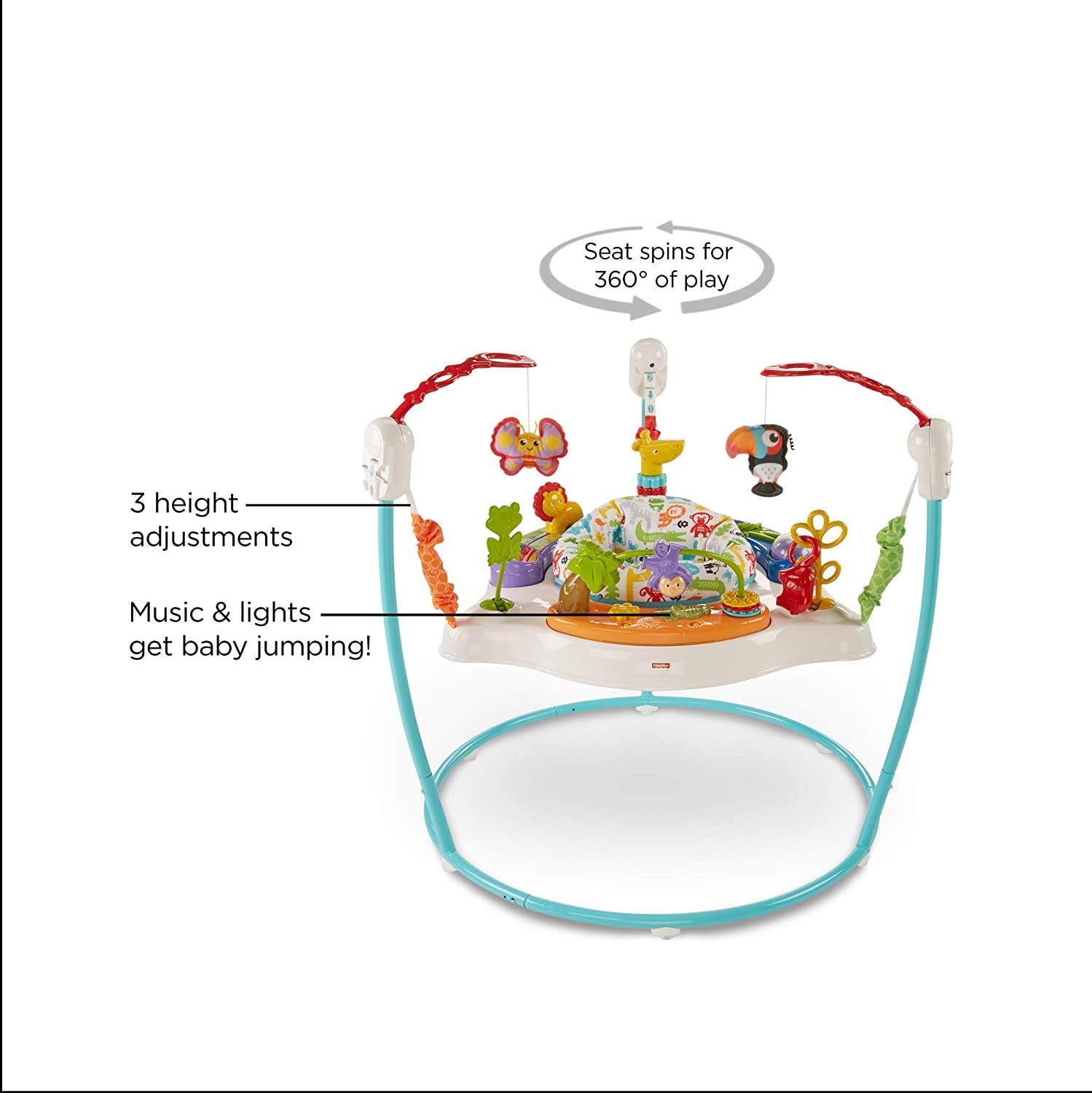 Your baby will go wild visiting this exciting jungle and all its fun activities! A rotating seat gives little ones 360-degree access to toys, activities and animal friends, including spinners, clackers, a bead bar, a mirror, and so much more. Tiny explorers will love discovering all the fun while music, lights, and sounds reward every jump. Where development comes into play Gross Motor: Jumping, balancing on those tiny toes, and reaching for all the toys & activities helps get your baby's gross motor skills going and growing! Sensory: Bright colors, lights, and a variety of sounds and textures help stimulate your baby's visual, auditory and tactile senses. Curiosity: There's so much for your little explorer to discover—from the animal pals "flying" above to their own sweet face in the mirror below! Use only with a child who can hold head up unassisted and who is not able to walk or climb out of product.