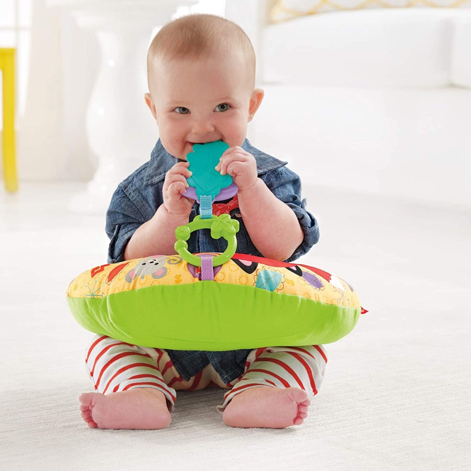 Support baby comfortably during tummy time. Make tummy time as comfy as possible for baby, with a vibrating, crescent-shaped wedge. Calming vibrations help soothe as your little one pushes up on the supportive wedge for tummy time. 10 minutes of playful music and woodland themed toys (within baby's reach) help keep the play exciting. And as baby grows, reposition the toys - the soft wedge provides support for sitting babies, too. Machine washable with electronics removed.
