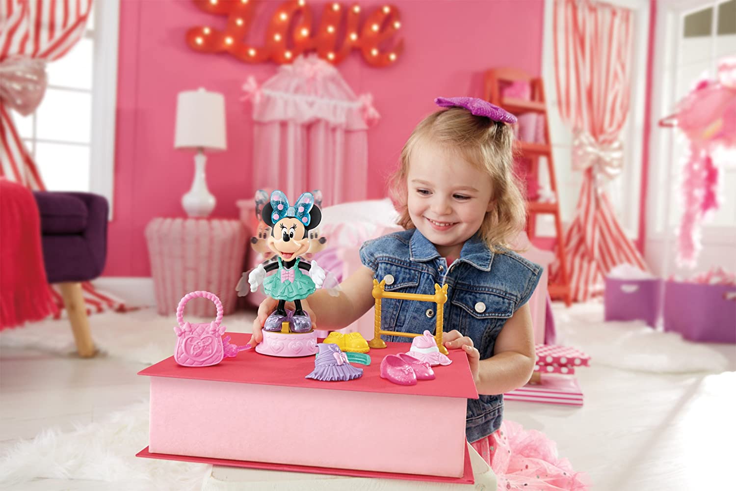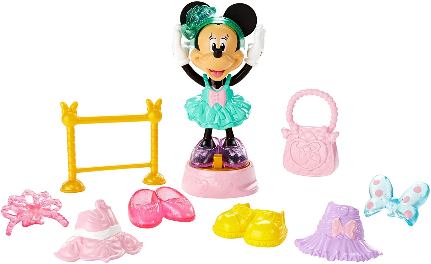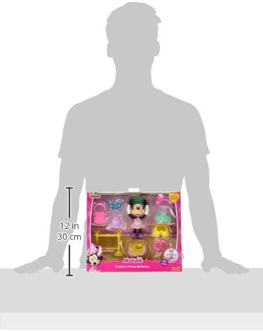Minnie Mouse is ready to pirouette her way to Prima ballerina as she spins and twirls! dress Minnie in one of three easy Snap-On outfits for the big show! place Minnie on her pirouette base and roll her forward as she performs a magical ballerina twirl. Figure set comes with a 5-inch Minnie figure with base in her ballerina pose along with 3 Ballet dresses, 3 bows, and 3 pairs of Ballet slippers. Also comes with a Ballet bar and purse – 13 pieces in all! pirouette base works with all 5-inch Minnie figures.