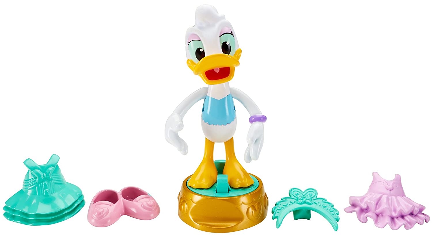 Daisy Duck is ready to spin and twirl like a beautiful ballerina! Dress Daisy in her easy snap-on outfit for the big show. Then, place Daisy on her pirouette base and roll her forward to make her spin and twirl. Pretty Pirouettes Daisy figure set comes with a 5-inch Daisy in a ballerina pose and a ballet outfit with a bow, ballet slippers, and 2 prima ballerina dresses. The pirouette base works with all 5-inch Minnie figures.