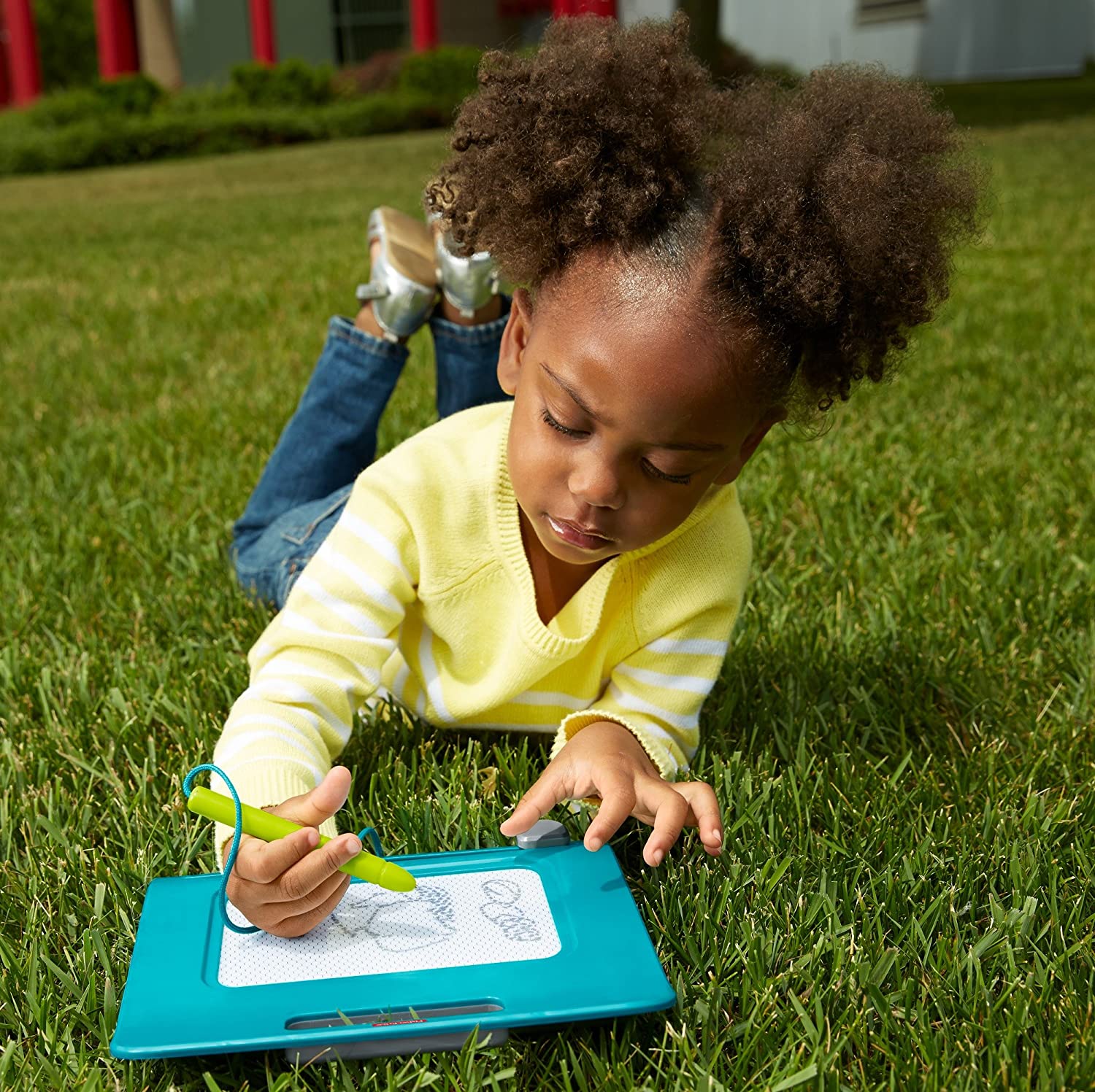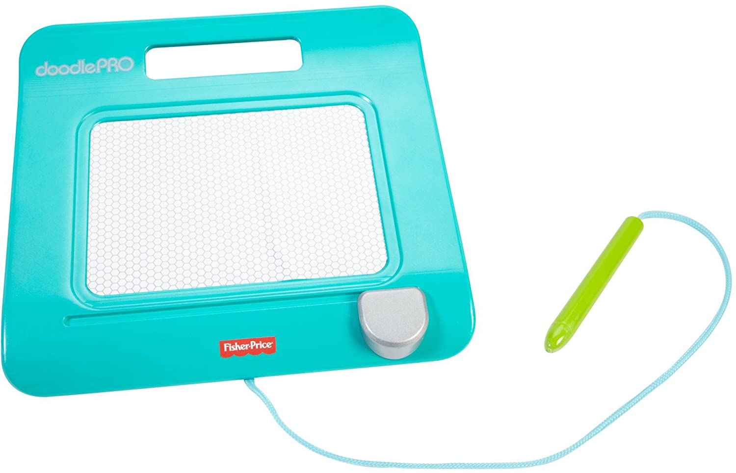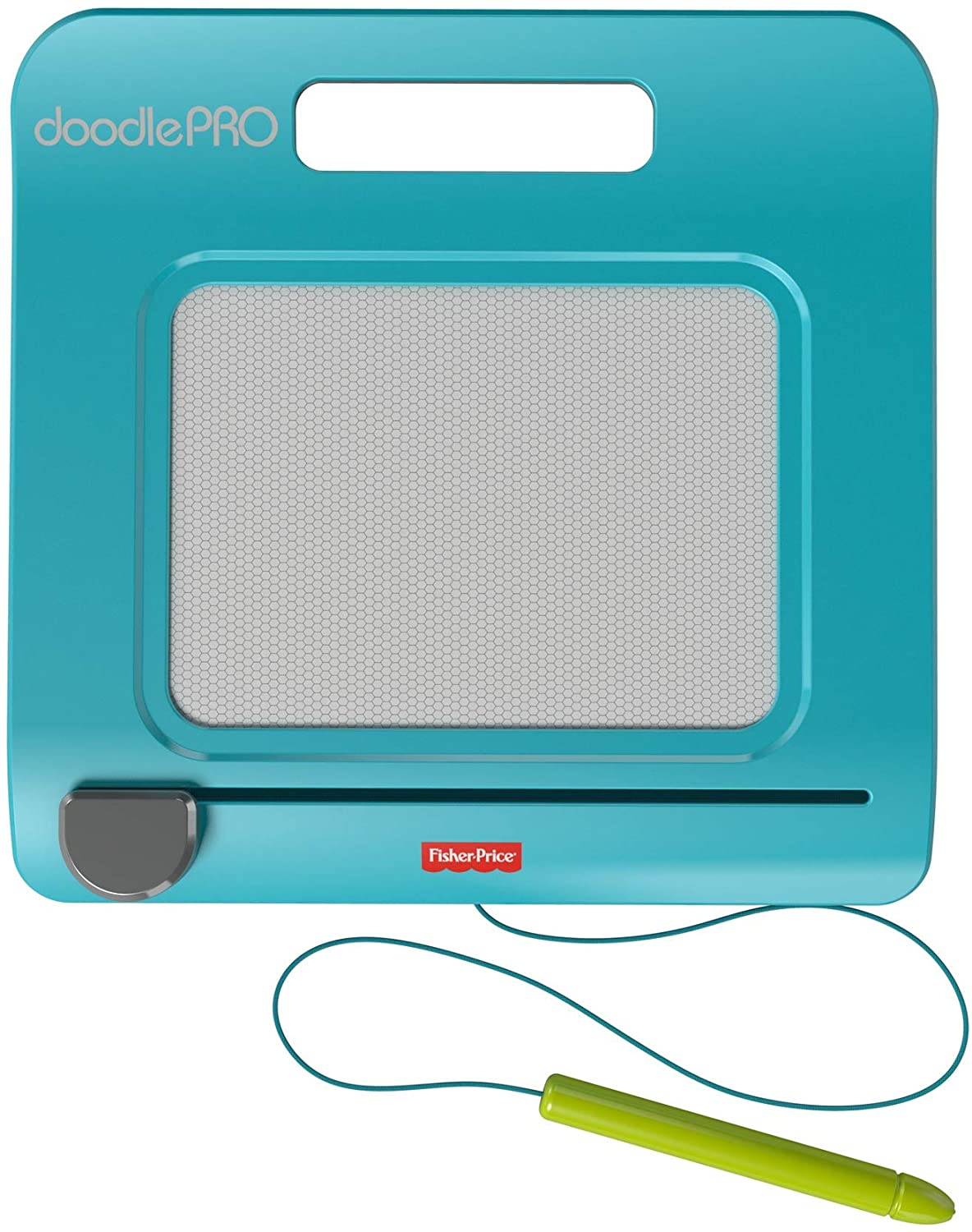 The sleek & slim Doodle Pro Trip is sized just right for on-the-go, mess free, magnetic drawing fun! The screen saver pen is attached so it can’t get lost, and the easy-slide eraser clears the screen so little ones can draw up new creations over & over again! The small size fits perfectly on a child’s lap, making it great for car or plane travel. Plus, the durable frame includes a built in handle, so it’s easy for kids to carry, wherever they go!