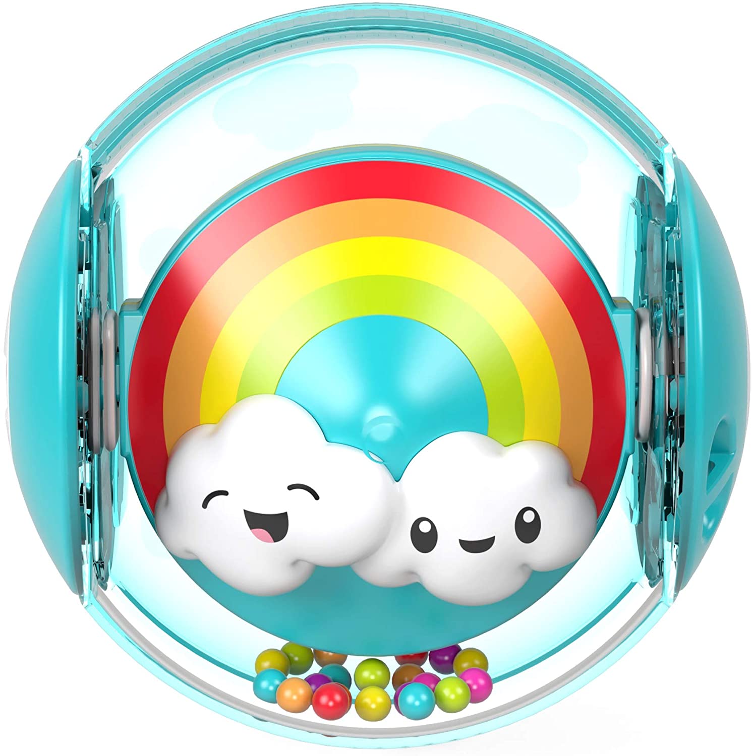 It's clear skies ahead for your baby with the Fisher-Price Hello Sunshine Rattle Ball! Little ones can shake, rattle, and crawl along with this half-clear and half-blue textured ball, which features a friendly sun on one side and cute clouds with a rainbow on the other side. As your baby shakes and rolls the rattle ball, the rainbow-colored beads bounce around inside, encouraging your little one to crawl after it.