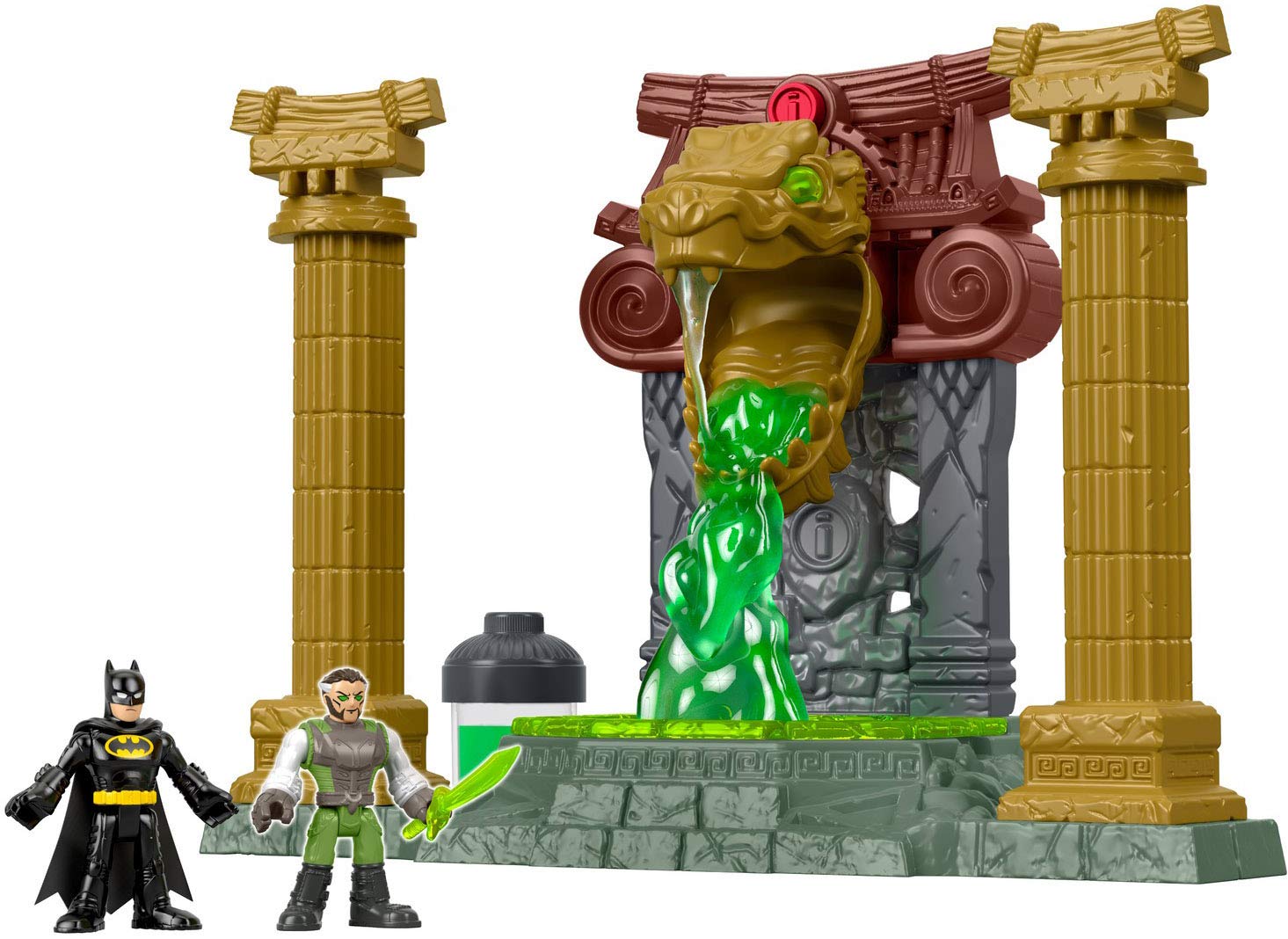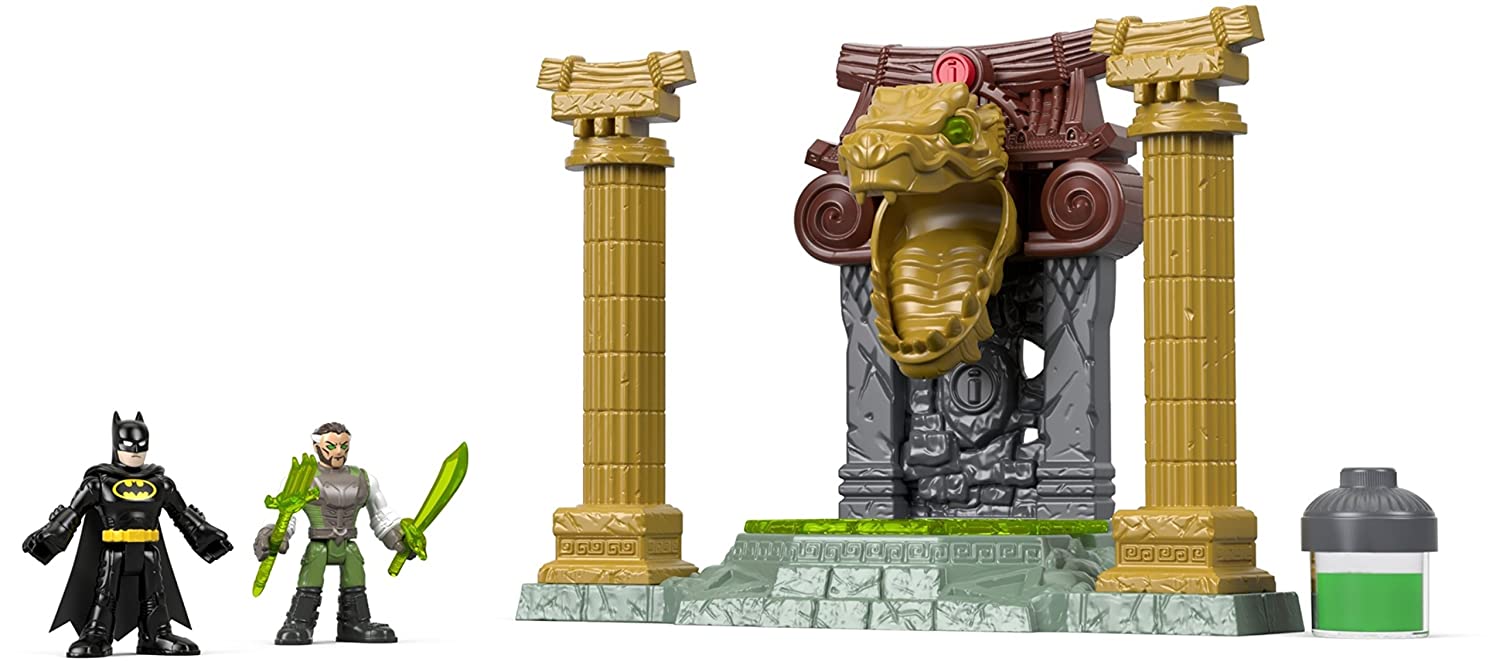 Ra's al Ghul hopes the power of the ooze pit can help him finally defeat the Caped Crusader. Pour the green ooze into the dragon's head, then press the red button to send it flowing down on the figure in the center. Can Batman defeat this extra-powerful Ra's al Ghul? That's for your young Super Hero to decide! Fisher-Price Imaginext Imagine What's Next!