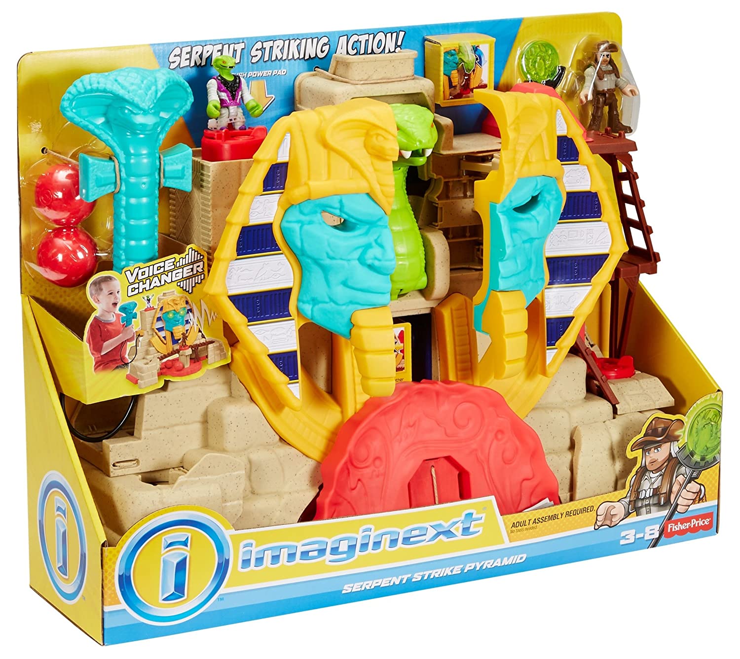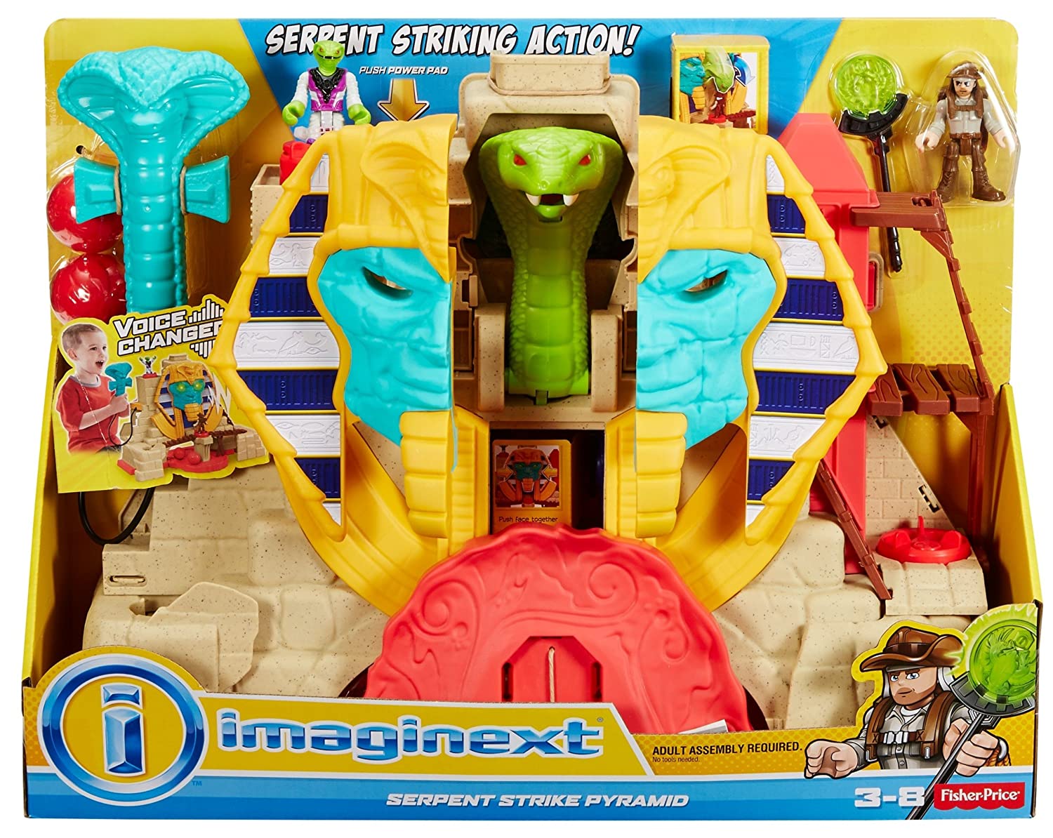 Treasure hunting is dangerous business! With the Imaginext Serpent Strike Pyramid, kids can explore all the hidden corners of this pyramid with the treasure hunter—but beware, the Serpent King has a few tricks up his sleeve to keep his treasures safe. Get the fun started by turning the front Power Pad to open the sphinx and reveal the giant serpent. (A turn of the top Power Pad will also open the sphinx.) Watch out, treasure hunter! With a push of the top Power Pad, the Serpent King unleashes his giant serpent for a swift strike attack! And by turning the third Power Pad, the Serpent King can send the treasure hunter running for cover from rolling boulders, which then knock out the wooden bridge. Kids can even add their own unique voices to the playset with the cool voice changer button. With the Serpent Strike Pyramid playset, kids can create all sorts of action-packed adventures! Imaginext Imagine What's Next! Where development comes into play; Cognitive: Imaginative play and storytelling helps develop kids' language skills and can foster an early love of reading.