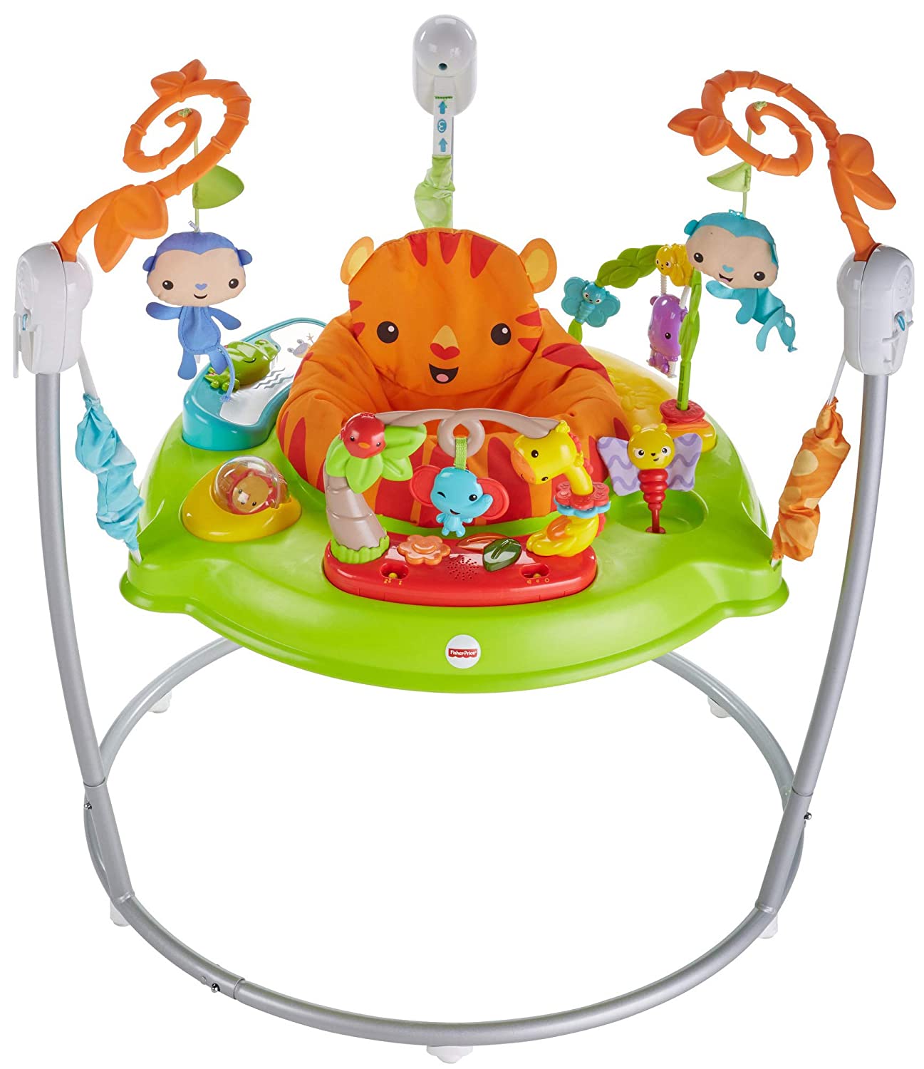 There's so much for little ones to discover with their animal pals on this Jumperoo - music, lights and exciting sounds reward their every jump! A rotating seat gives your baby 360-degree access to toys, activities, and animals, including soft monkeys overhead, spinners, clickers, a bead bar, mirror and so much more. With three height adjustments, the reaching, grasping, and jumping fun can continue even as your tiny explorer grows! Where development comes into play Gross Motor: Jumping, balancing on those tiny toes, and reaching for all the toys and activities helps get your baby's gross motor skills going and growing! Sensory: Bright colors, lights, and a variety of sounds and textures help stimulate your baby's visual, auditory and tactile senses. Curiosity & Wonder: There's so much for your little explorer to discover-from the animal pals "flying" above to their own sweet face in the mirror below! Use only with a child who can hold head up unassisted and who is not able to walk or climb out of product.