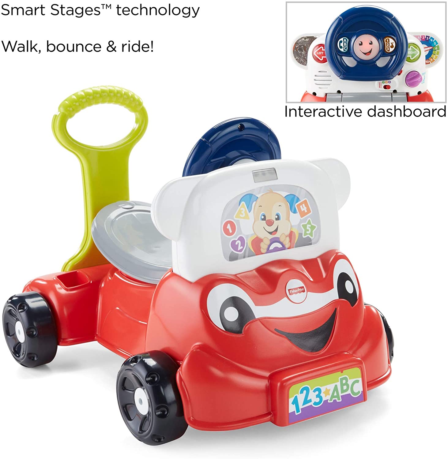 Buckle up and take the wheel, baby! The Laugh & Learn 3-in-1 Smart Car lets your child "drive" the learning play as they grow from walking to bouncing and riding, with encouraging phrases to keep them moving. As kids cruise around and play with the interactive dashboard, they'll hear songs, sounds, and phrases about the alphabet, opposites, counting, and more!