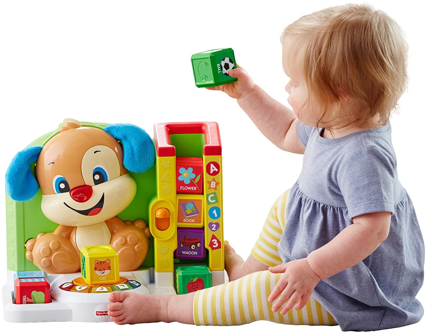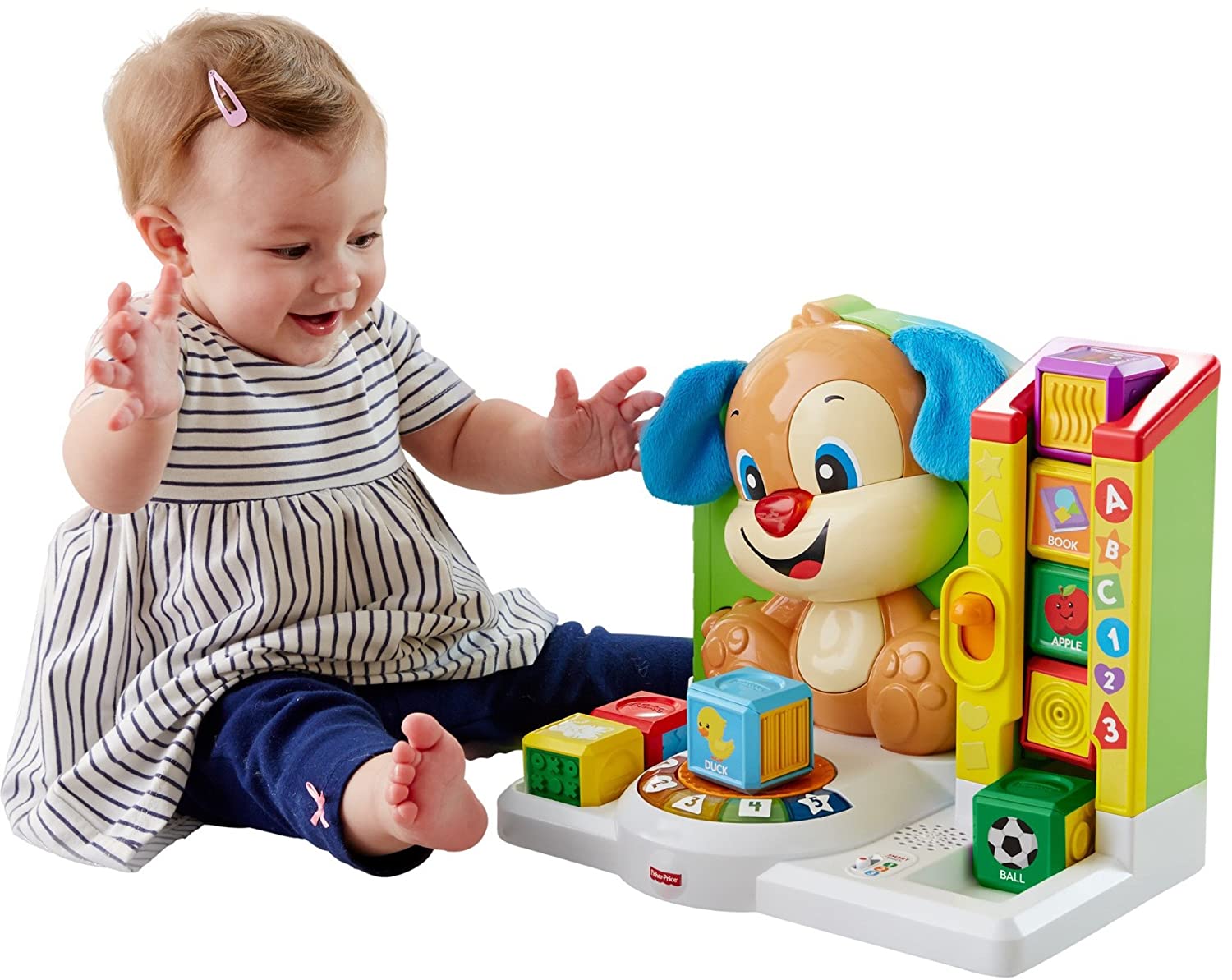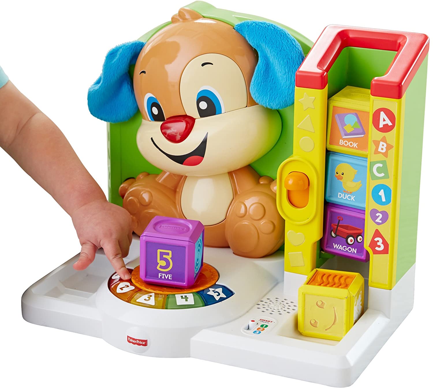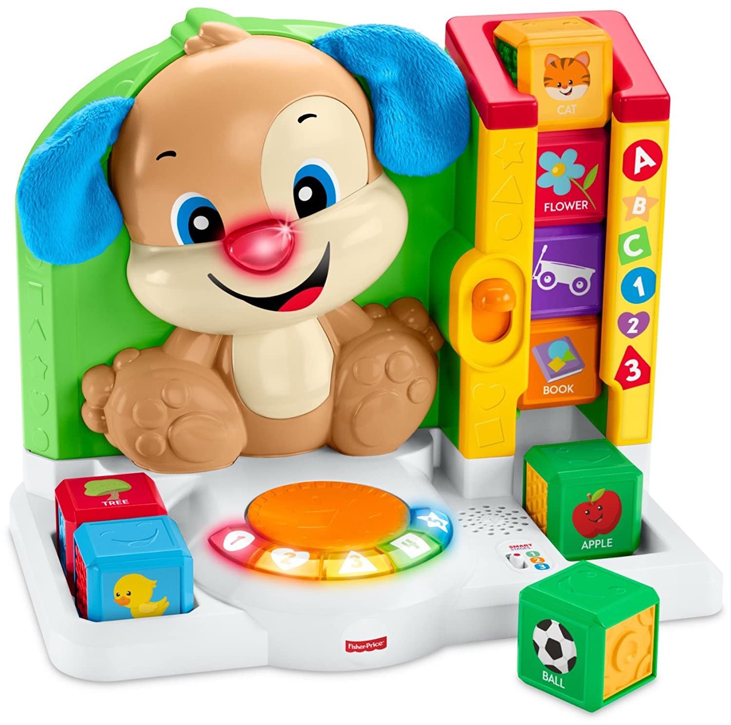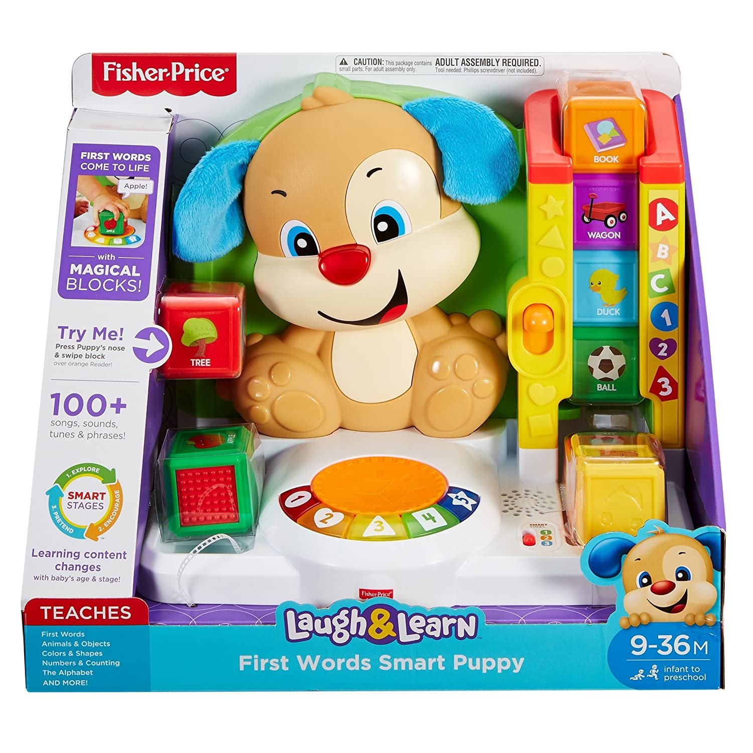 The Laugh & Learn First Words Smart Puppy teaches your little one first words with fun songs, sounds, phrases, and exciting hands-on activities! When babies swipe each block across Puppy's "magical" Reader, they'll hear sounds, phrases and more that introduce new words and objects from the big world around them. This helps build those important connections between the objects they see and the words they hear, which is what helps turn those first babbles into first words! Little learners will have a blast pressing the lever to send the blocks tumbling down the chute and pressing Puppy's nose for playful music and lights. The learning continues as they press the five light-up buttons to hear songs and sounds about shapes, colors, and more! As your little one grows, you can level-up the Smart Stages technology to fit your baby's age and stage: Level 1: Explore – As babies explore all around, pressing buttons and swiping blocks on the Reader, they'll hear songs, phrases & more that help build important connections that lead to first words. Level 2: Encourage – In this level, Puppy helps expand on little ones' vocabulary as they're prompted to find different numbers & shapes – with rewards when they do! Level 3: Pretend – This level lets your (little) big kid put those first words to use! As they swipe each block across the Reader, they can imagine that they're off on different adventures with fun songs from Puppy!
