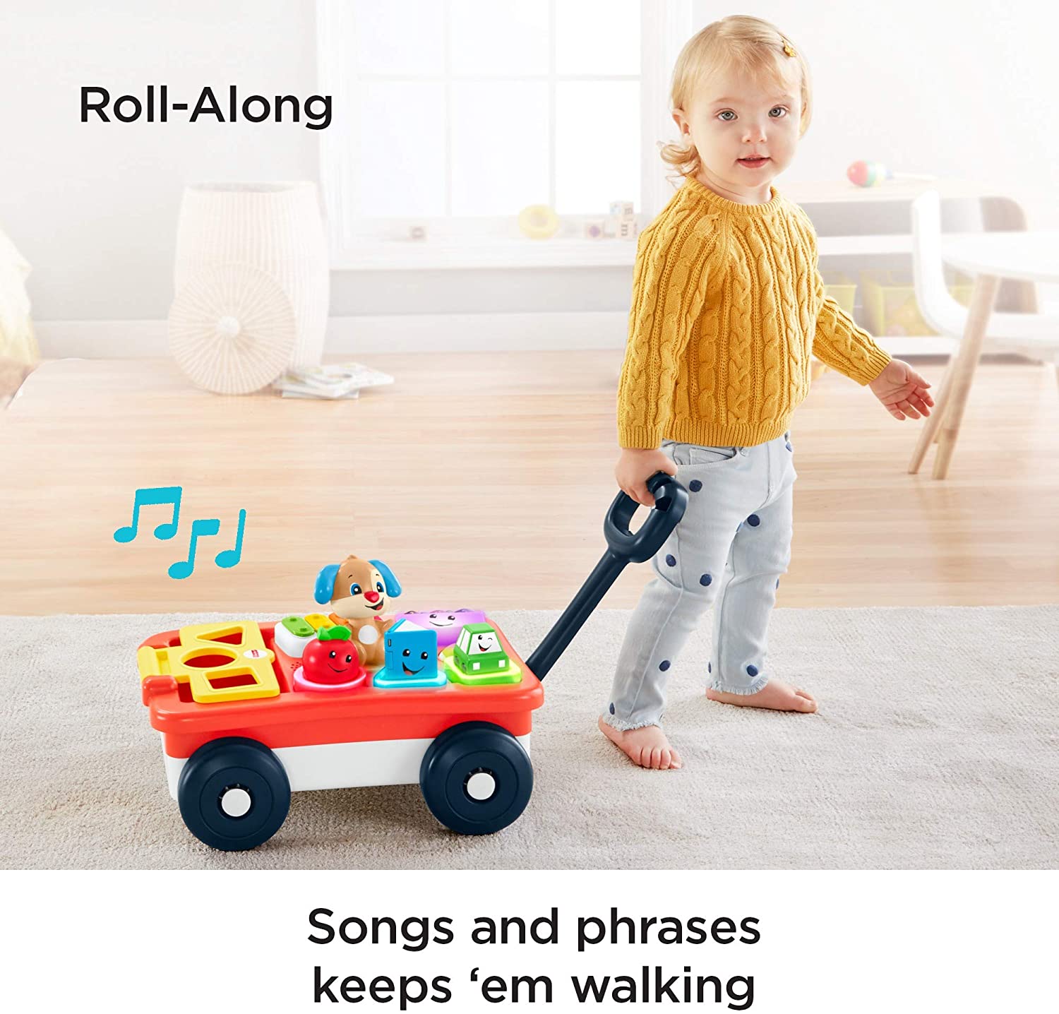 Your baby can load up on learning and hands-on fun with the Laugh & Learn Pull & Play Learning Wagon. This interactive red wagon features a variety of activities for sitting babies to bat, press, rattle, and flip, as well as light-up buttons, xylophone "keys" and more that activate songs, sounds, and phrases! As your baby grows, so does the exciting play, with Smart Stages technology and a motion sensor that rewards your toddler as they walk and pull the wagon along.Where development comes into playEarly Academics: Playful songs and phrases introduce your baby to the alphabet, colors, counting, Spanish words, and shapes.Fine & Gross Motor: Lots of grasping, flipping, and pressing play helps strengthen your baby's dexterity and hand-eye coordination. Gross motor skills also are engaged as your baby goes from sitting up to interact with the wagon to walking and pulling it along.Thinking Skills: Figuring out how to sort the shapes through their corresponding slots through trial & error helps your baby develop problem-solving skills.