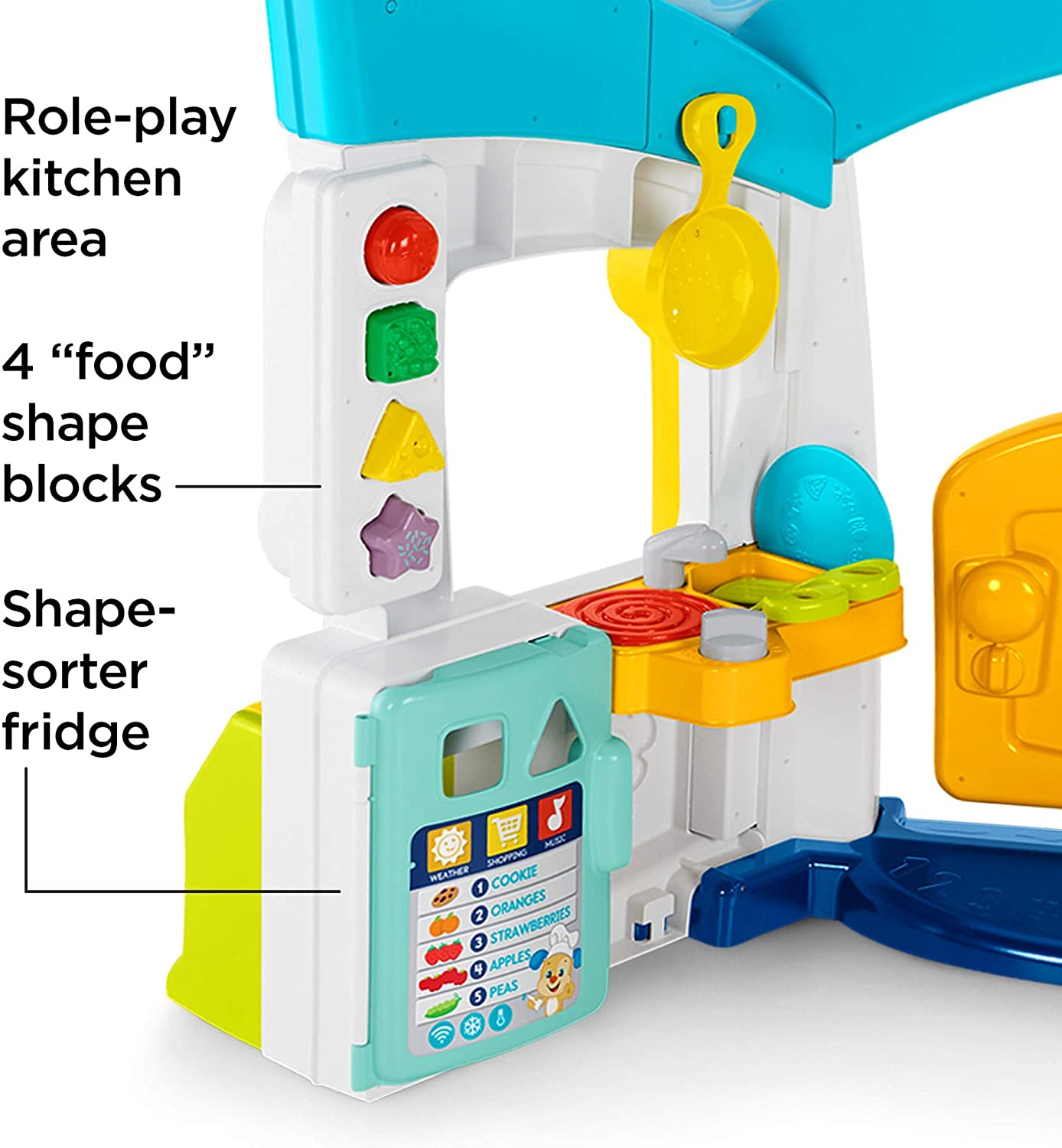 - Home office area with light-up thermostat, office light, and clicker-clock, plus a kitchen area with shape-sorter fridge and role play pieces