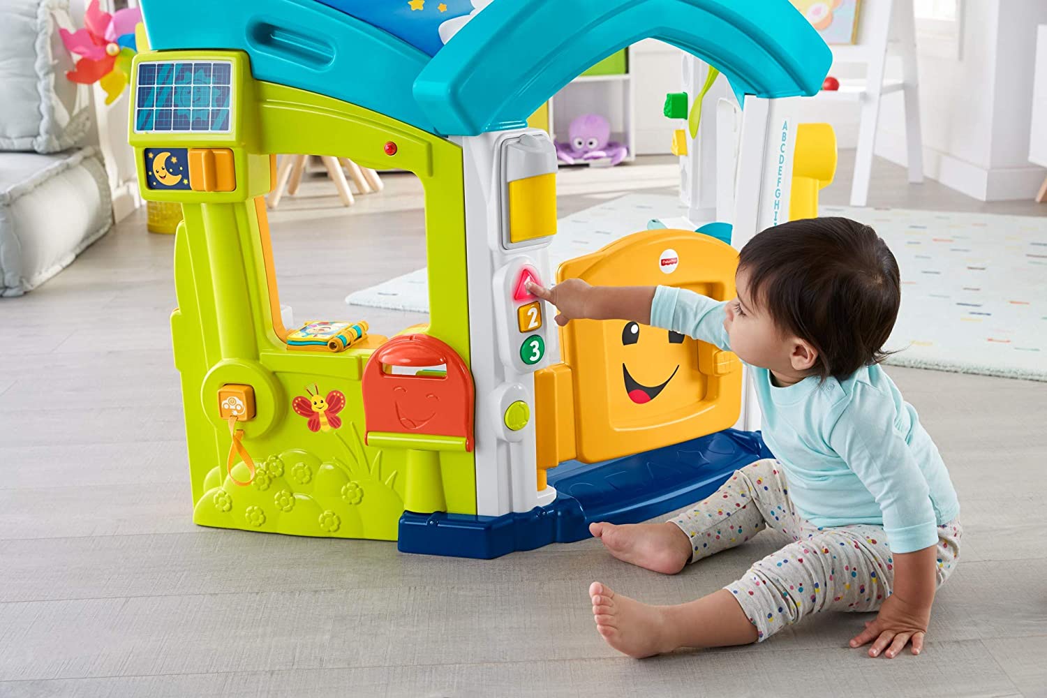- So much to explore: interactive “hub”, crawl-through door, porch light, open & close mailbox, light-up house numbers, drop-through rain gutter & balls, shape-sorter recycling bin & more!