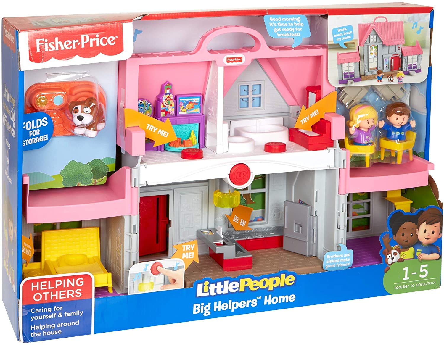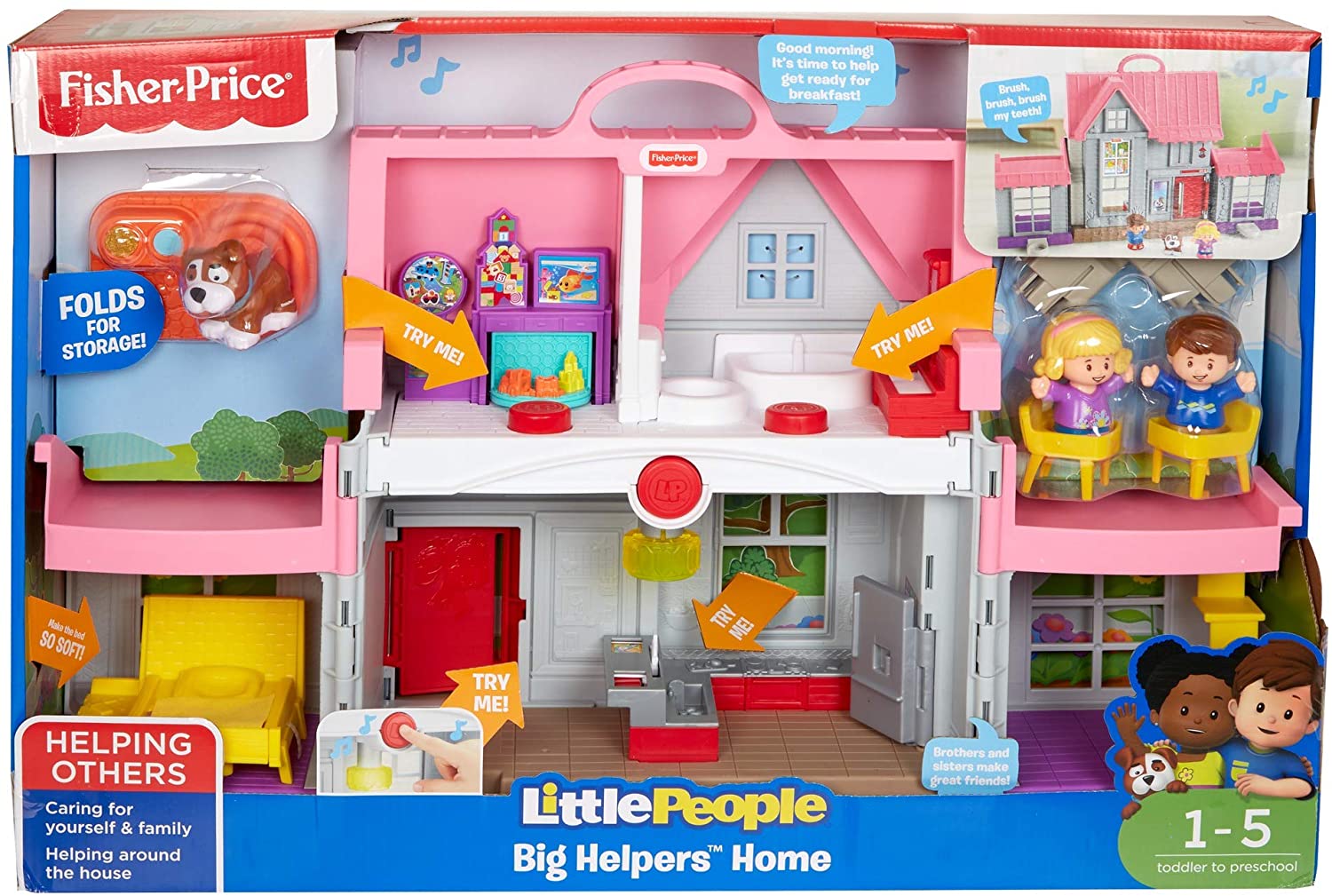 Welcome home, kiddo! When toddlers open the Fisher-Price Little People Big Helpers Home, they'll discover multiple rooms filled with realistic features and lots of hands-on play. As little ones explore the pink house, playful songs, sounds and phrases encourage them to help around the house, care for their animal friends, and even introduce healthy habits! Little things that make a big difference Helping Others: Sung songs and fun phrases teach kids about teamwork, playing together, helping others, manners, and kindness. Imaginative Play: With easy-to-grasp figures and a familiar home theme, toddlers can use their imaginations to create stories as they play. Curiosity & Wonder: Little ones are introduced to cause and effect as they discover that fun sounds, phrases, and actions happen when they press different buttons around the house.