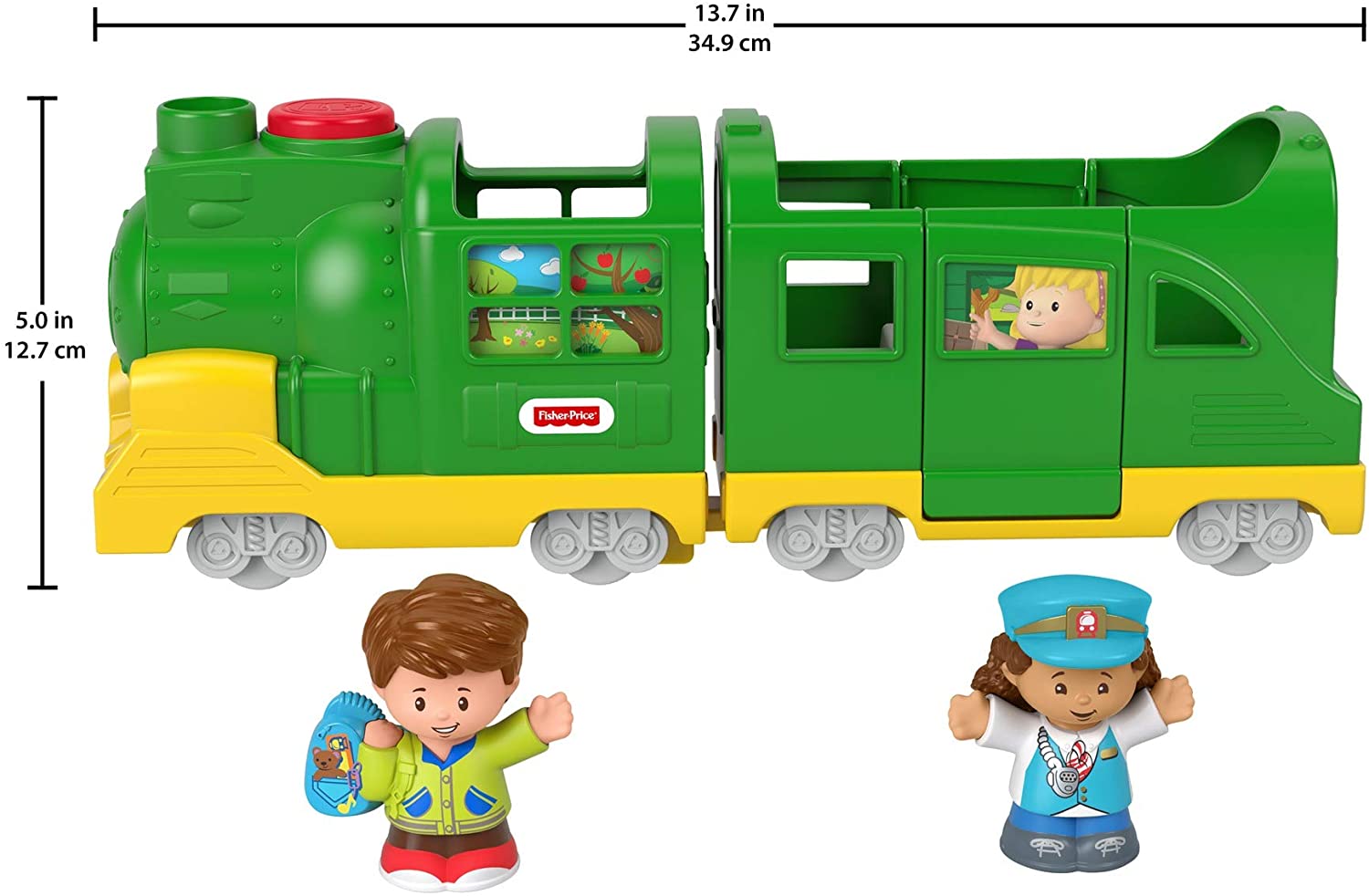 ​Toot, toot! All aboard the Little People Friendly Passengers Train! With realistic train sounds, fun songs, and a light, toddlers can create all sorts of fun travels with their Little People friends, Jack and Conductor Jane! When they press Conductor Jane into her seat, they'll hear phrases and songs about following rules and respecting others. Ready for an adventure? Push the Discovery Button to see the window display pop up as more songs, sounds and phrases play! It's full steam ahead into learning fun with this interactive Little People train. Where development comes into play Manners & Kindness: Sung songs and phrases introduce toddlers to saying please & thank you, following rules, and respecting others. Imaginative Play: With easy-to-grasp figures and a familiar train vehicle, toddlers can use their imaginations to create stories as they play. Curiosity & Wonder: As kids discover how to activate the songs, sounds, and light by pressing the Discovery Button, they're introduced to cause & effect!