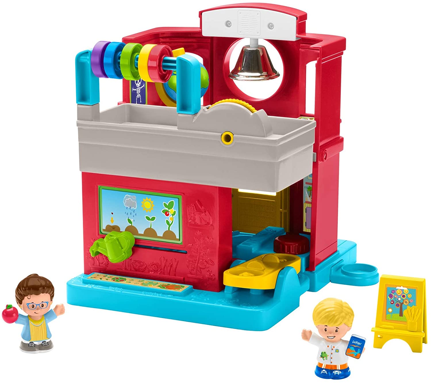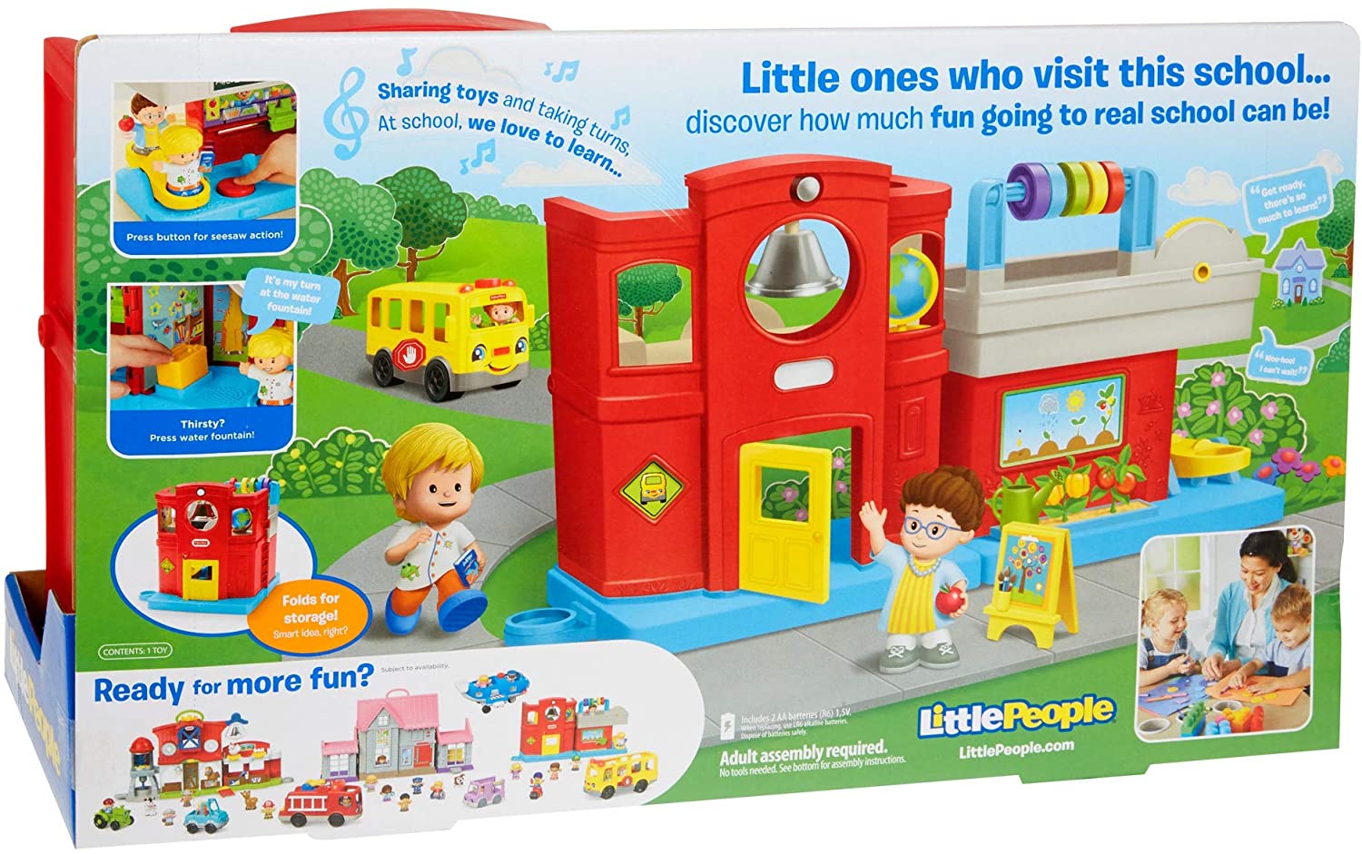 There are new friends to meet and so much to learn and explore at the Little People Friendly School! With this interactive playset, your toddler can practice their ABCs and 123s with Eddie while discovering how nice it is to share, take turns, and make friends. Discovery Buttons bring the schoolhouse to life with songs, sounds, and even a working teeter-totter! Where development comes into play Fine Motor: Grasping the figures and interacting with the playset's activities, like spinning the globe and ringing the bell, help toddlers strengthen their dexterity and hand-eye coordination. Relationship Skills: Playful songs and phrases introduce kids to greetings, manners, and making friends. Curiosity & Wonder: Toddlers can discover the fun of cause & effect as they figure out how to make fun things happen by pressing the Discovery Buttons.