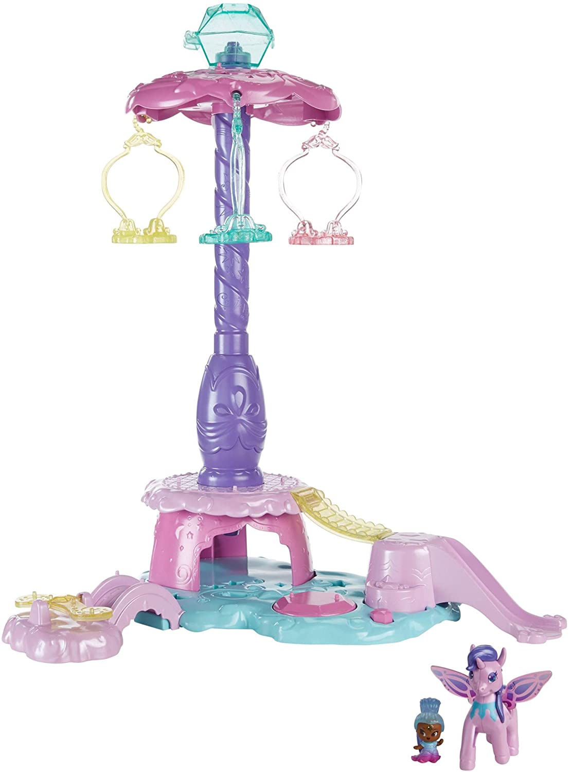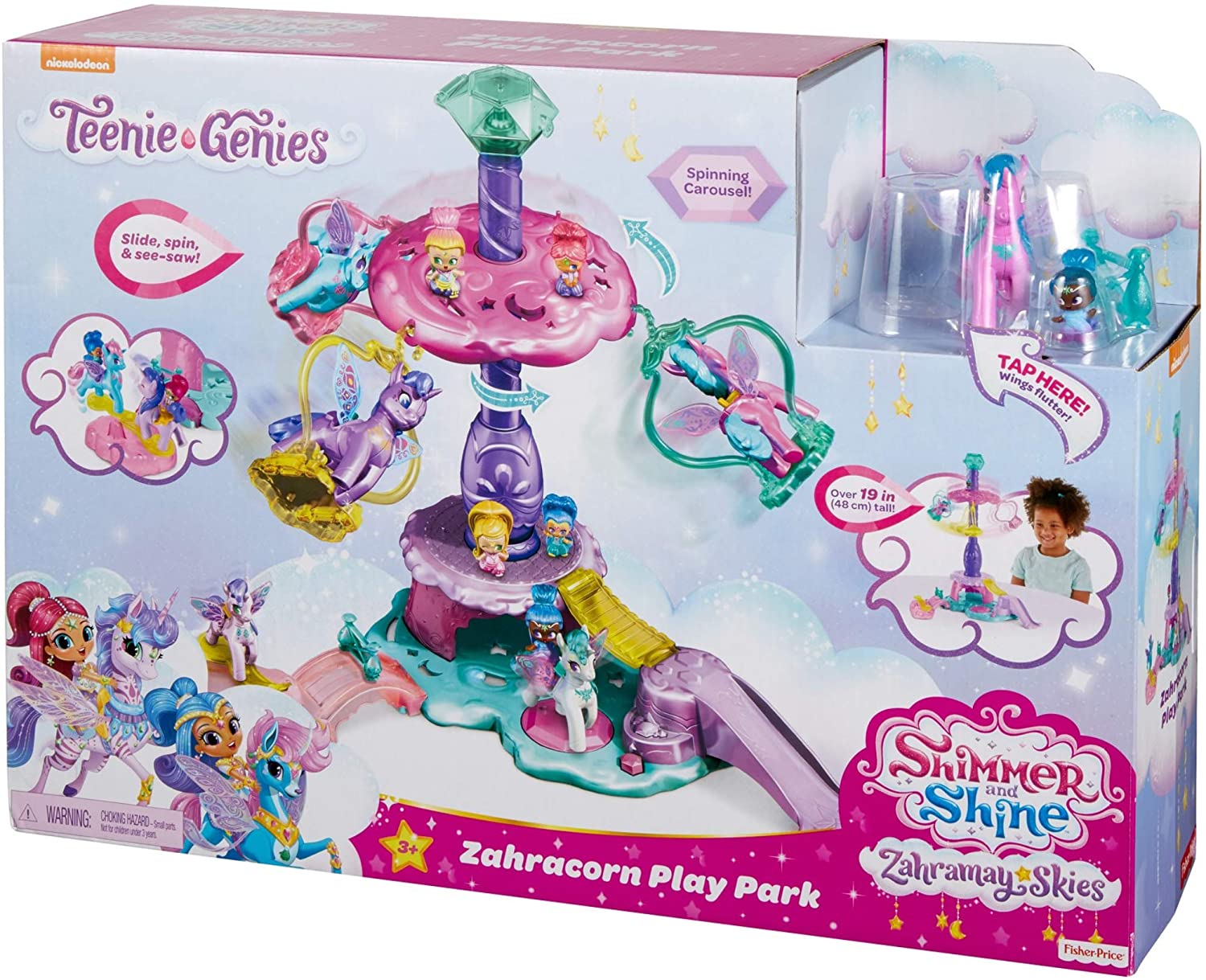 This Shimmer & Shine, Teenie Genies playset is inspired by Zahracorn Park, the place where the magical Zahracorns of Zahramay Skies visit and play! This pretty pink and purple playset stands over 19 in. (48 cm) tall and features lots fun activities so your little genie can pretend to zoom, soar and slide through Zahramay Skies! the play park playset features a seesaw, slide, bouncy platform and a magical spinning carousel! Kids can simply lift the carousel's canopy up to the top of the tower and then let it go to see the Zahracorns spin around and zoom down into the play park! the playset comes with Stardust Genie Adara and her Zahracorn Dahliza! Dahliza features sparkly, springy wings that flutter when bounced! the playset also features lots of places to peg, play and display more Teenie Genies (sold separately and subject to availability). Includes playset, Adara, Dahliza and a hurdle play piece. .
