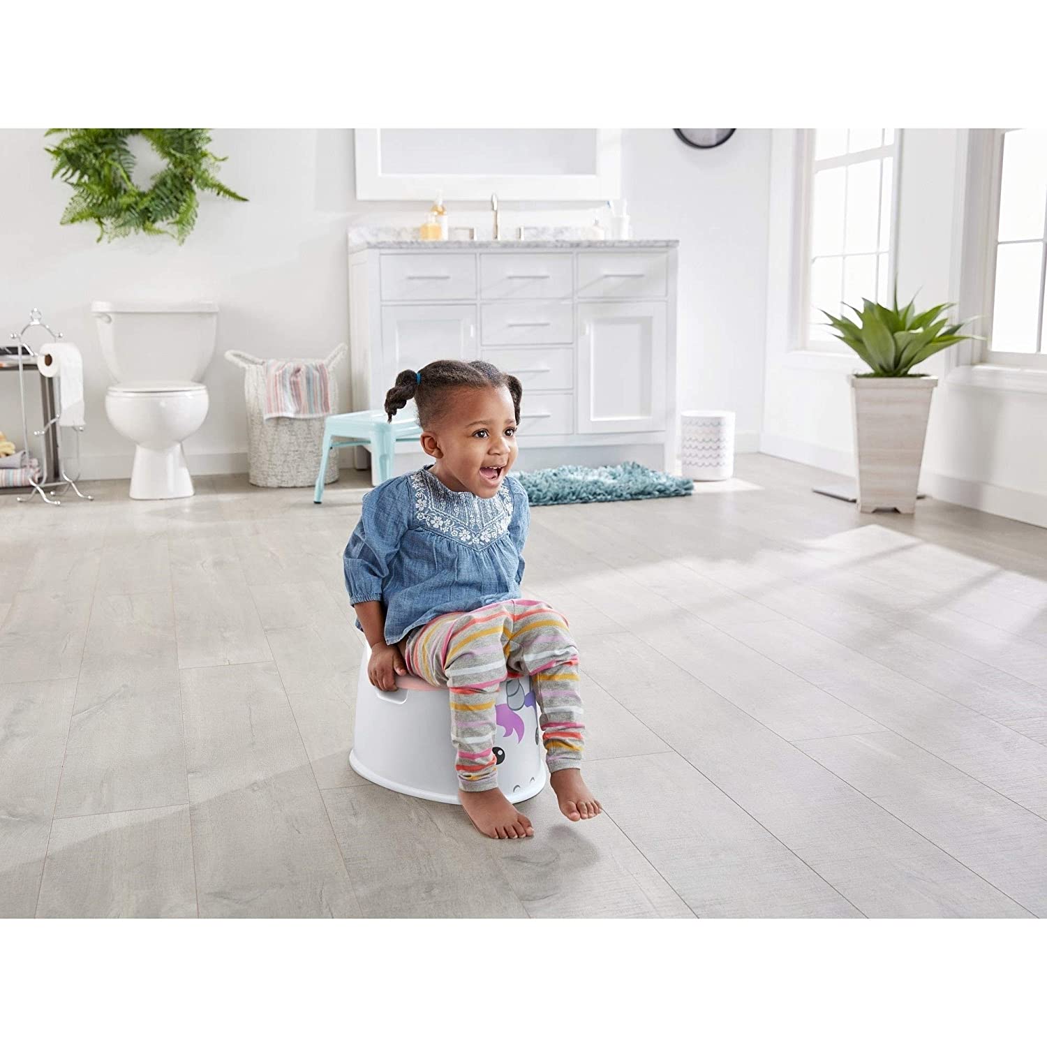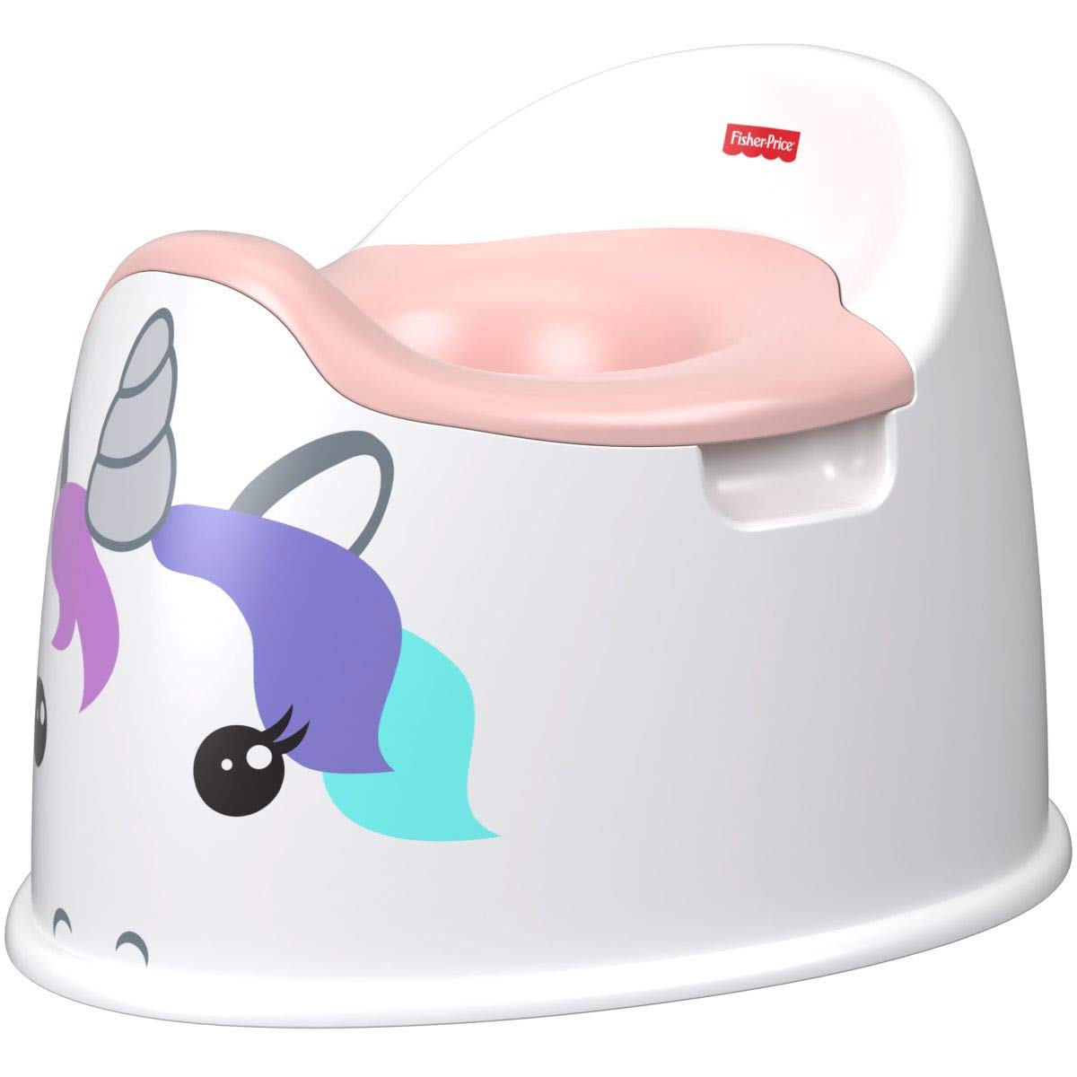 Everybody's gotta learn, and the Fisher-Price Unicorn Potty helps the training process along with a magical potty pal. Its friendly face and easy-grasp handles help toddlers feel more comfortable and secure as they do their business, while the built-in splash guard and removable bowl helps keep cleanup quick and easy. Where development comes into play Gross Motor: As little ones independently lower themselves onto the potty (and get back up again!), they'll develop balance & coordination. Self-Identity: Every successful visit to their potty pal helps build up your toddler's self-confidence! Security & Happiness: The low seat and easy-grasp handles help toddlers feel secure and grounded as they sit on the potty and are introduced to the potty routine.
