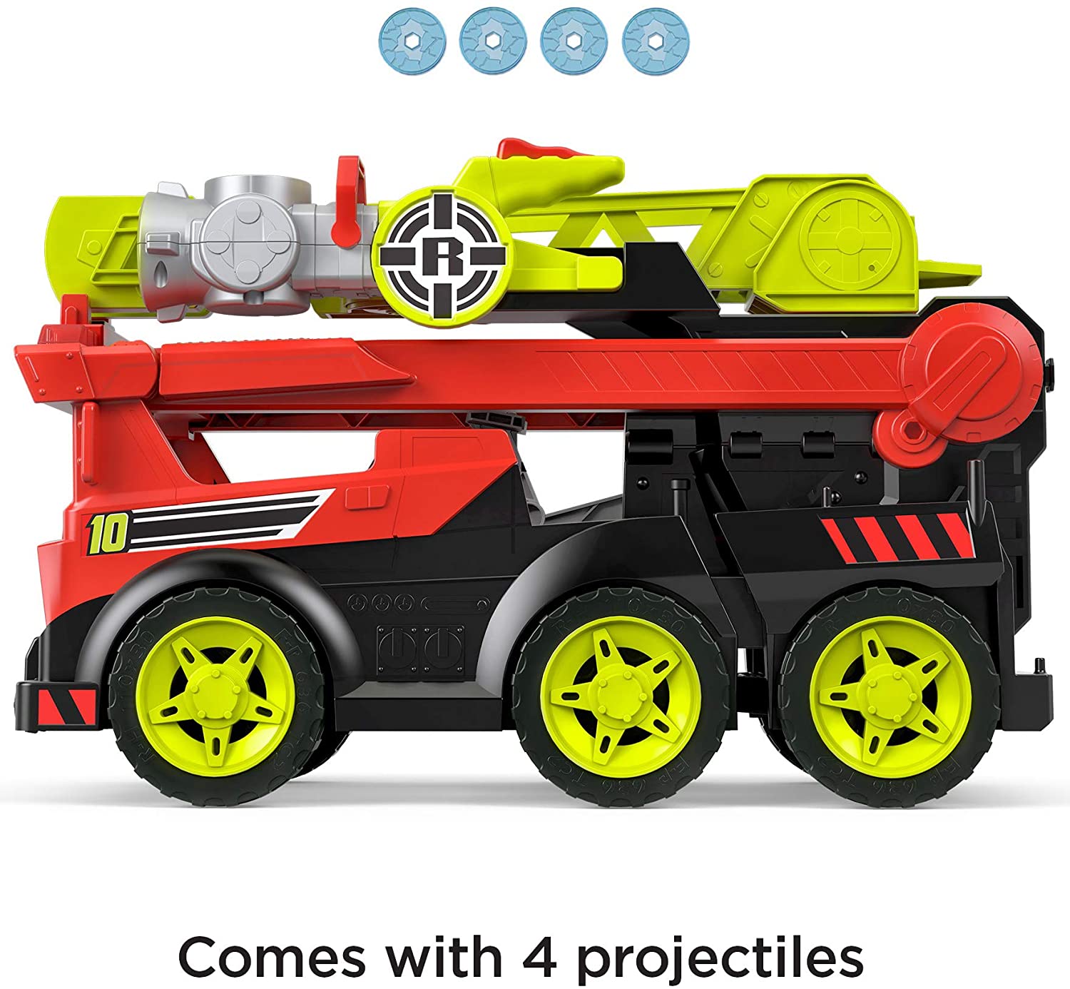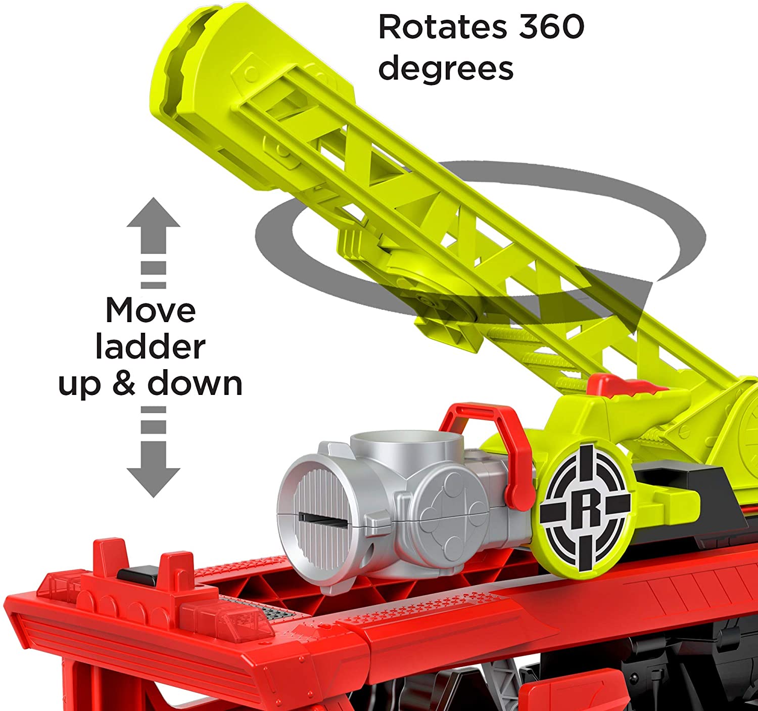 When a giant blaze breaks out, the Rescue Heroes team races into action with their fully loaded Fire Truck. Uh-oh, those flames are getting out of control! Pull the handle on the truck to transform it from a vehicle to a large, fire-fighting machine with emergency lights and alarm sounds. Use the ladder and claw to help remove debris, and pull the lever on the water cannon to launch projectiles and douse the flames! When everyone is safe and the situation is under control, the Transforming Fire Truck can be manually reset to vehicle mode, so the team can head out. Mission accomplished! (Rescue Heroes figures sold separately.)