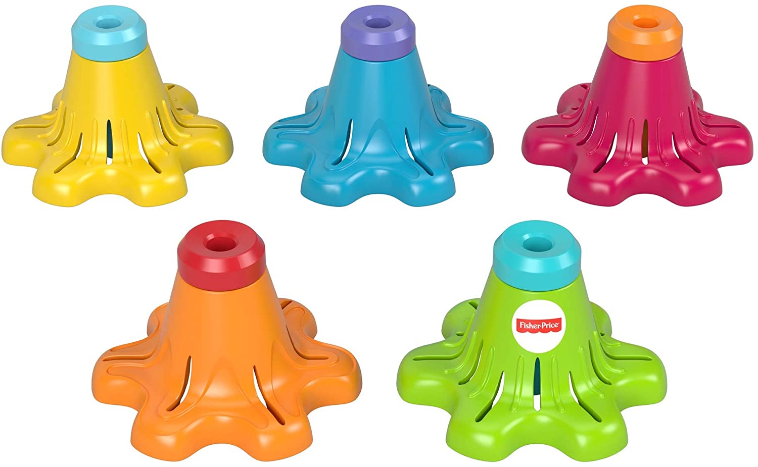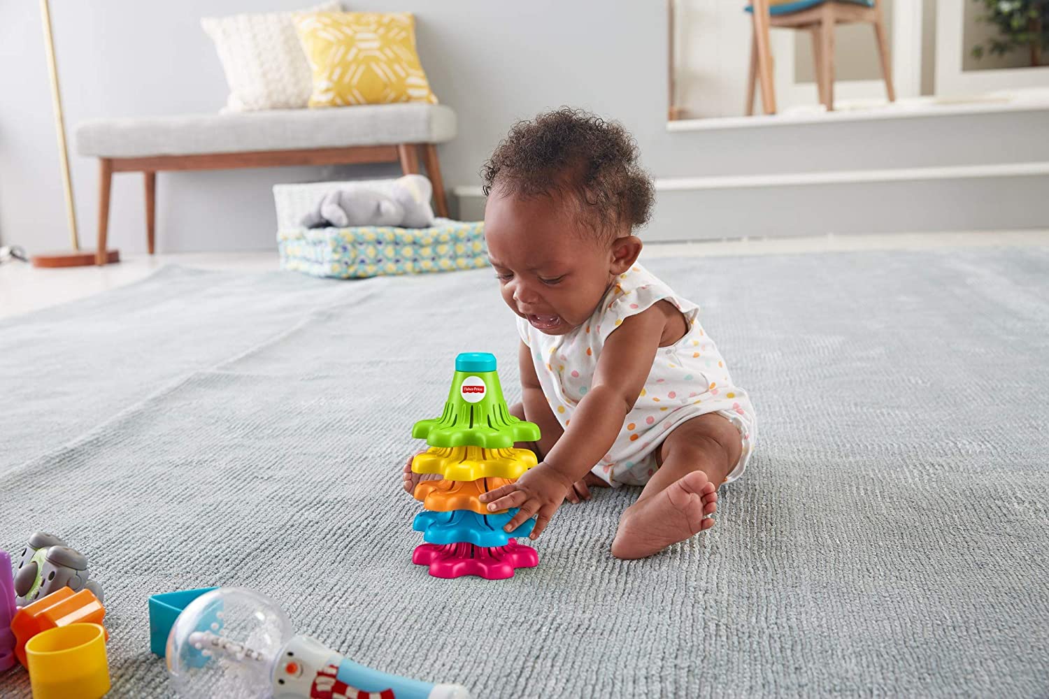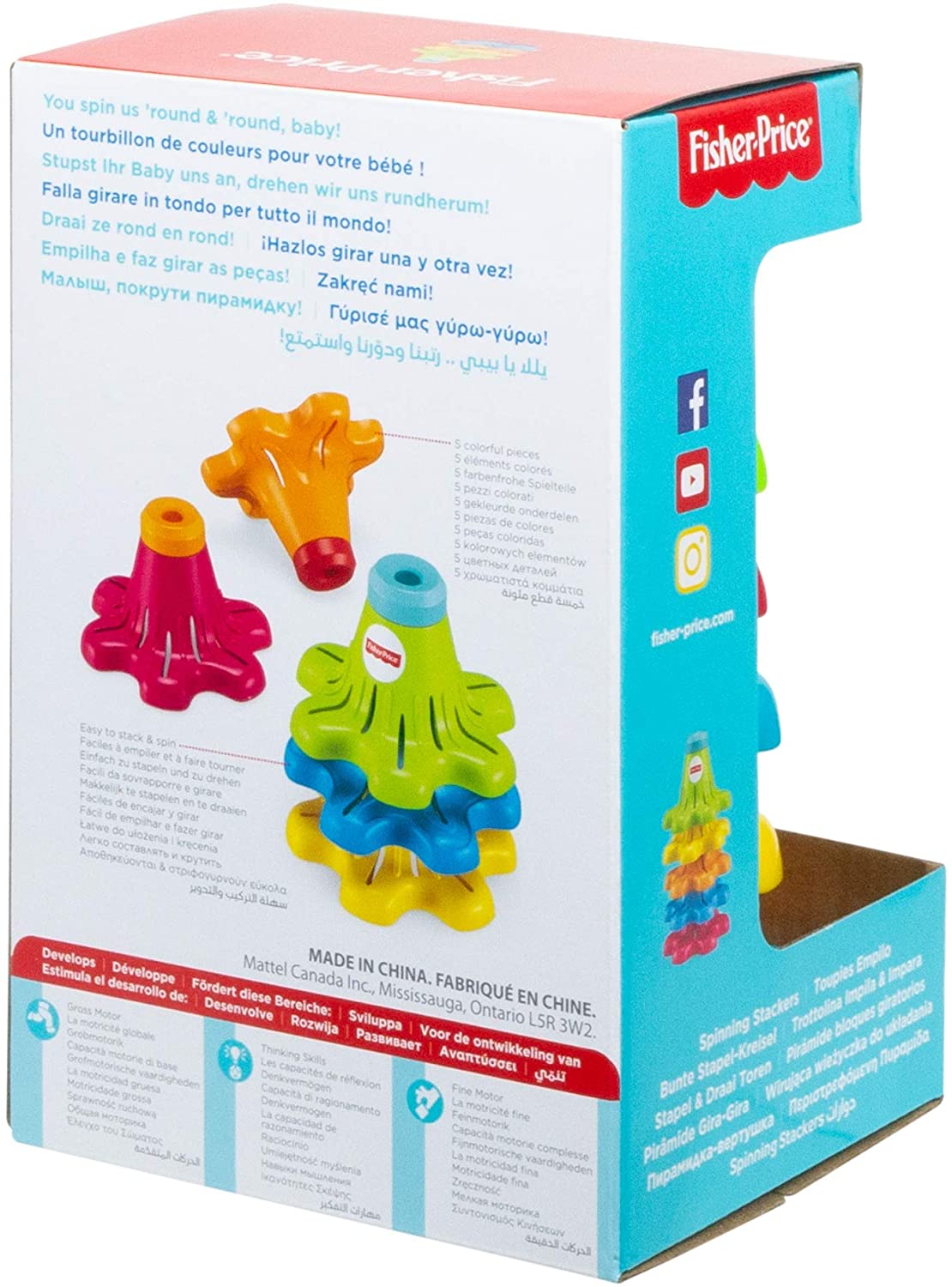 Stack 'em up & spin 'em around! The Fisher-Price Spinning Stackers keeps little hands busy as can be with a fun twist on classic stacking play. Your baby can stack the five colorful toys up high, then bat to make them spin 'round and 'round. Where development comes into play Gross Motor: Little ones develop balance and coordination as they learn to sit-up on their own and reach out to interact and bat-at the spinning stackers. Thinking Skills: As your baby figures out how to stack, unstack, and spin the stackers, they're developing important problem solving skills. Fine Motor: All that grasping, stacking, and spinning helps your baby develop hand-eye coordination.