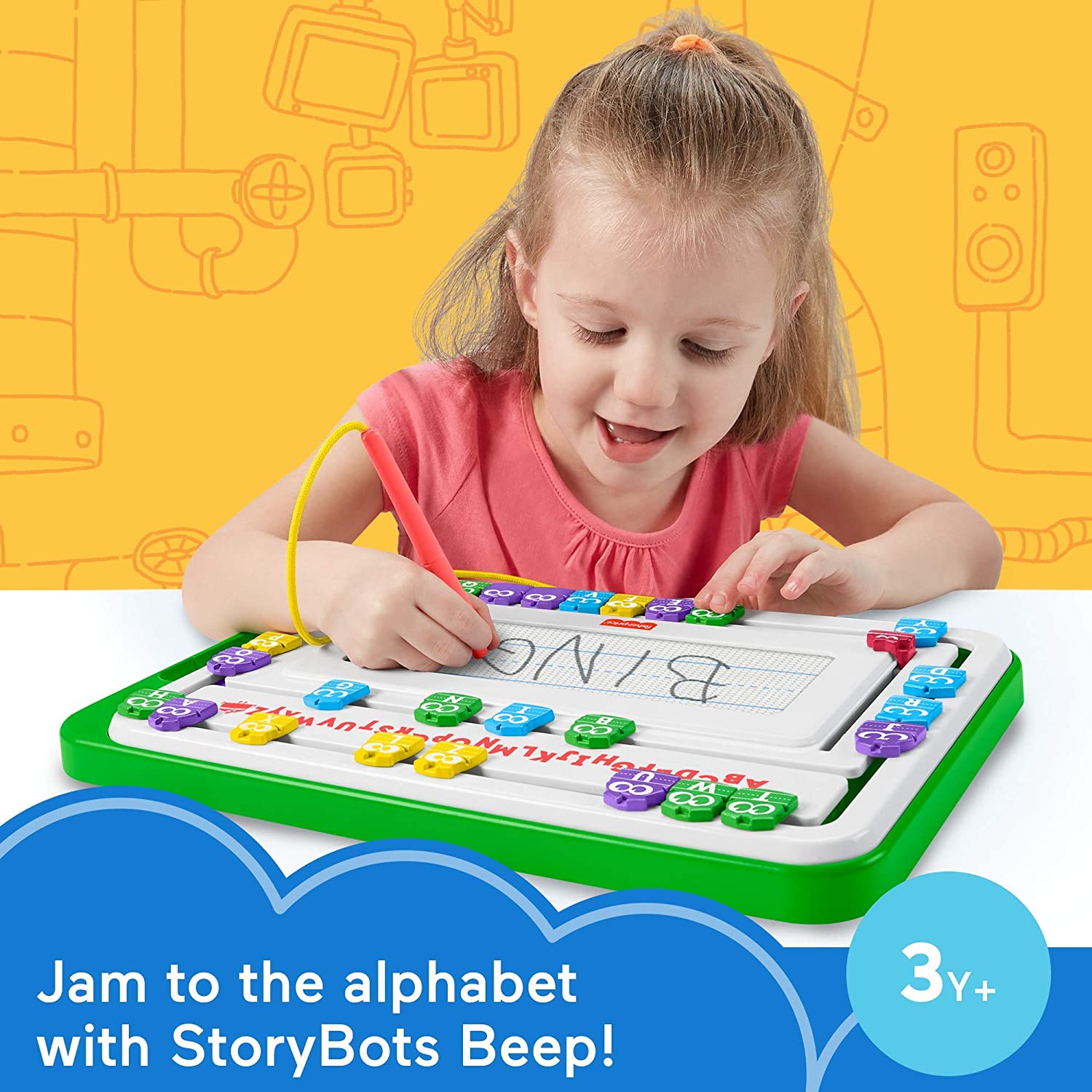 Whether it’s B-E-E-P or B-O-O-P, writing letters with the StoryBots is totally F-U-N. The Fisher-Price StoryBots Slide Writer magnetic drawing board gives preschool kids a mess-free way to practice spelling and writing different words with their favorite characters from the hit series, Netflix's StoryBots. Kids can slide the moveable tiles around to make a word, then use the tethered stylus pen and guidelines on the screen to practice writing the word, letter by letter. The erasable magnetic screen makes it easy to clear the board and start again (and again). This travel-ready drawing board also comes with a StoryBots stencil, so kids can draw some of their favorite members of Team 341B, too!