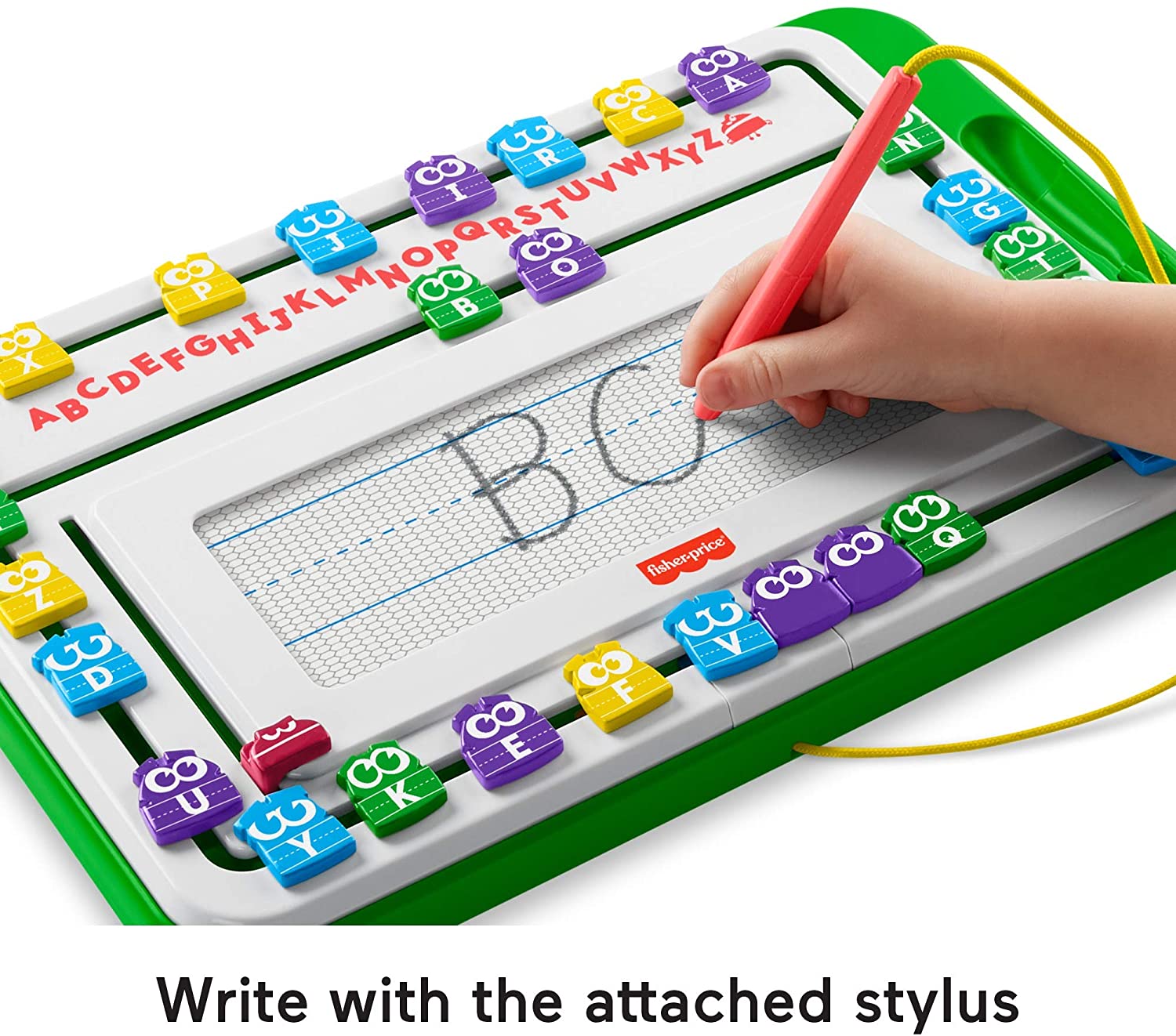 - Moveable letter tiles, print guidelines, and attached stylus pen help kids practice spelling and writing words