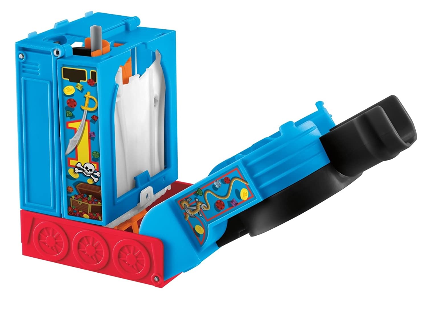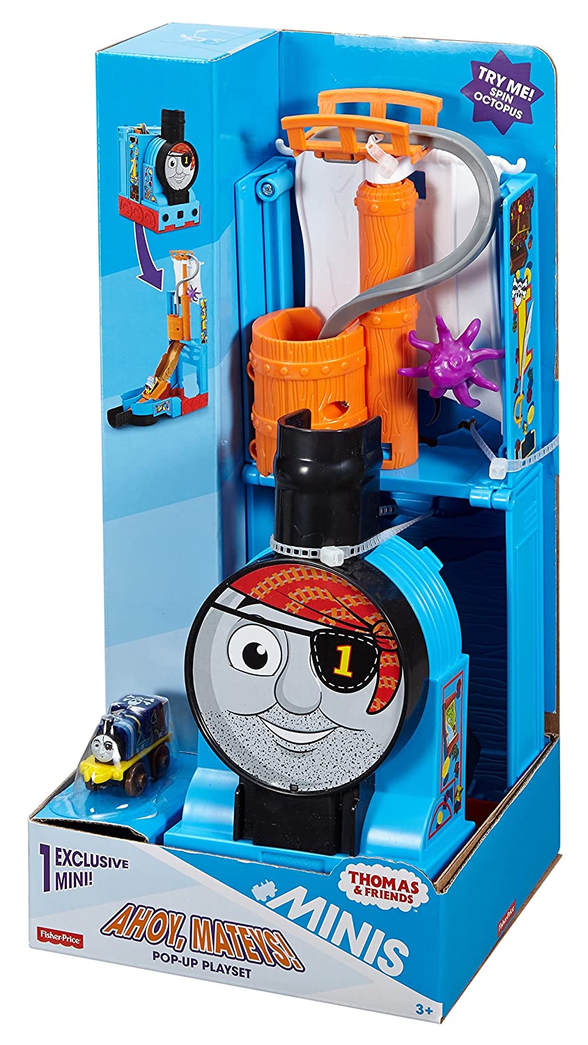 The Fisher-Price Thomas & Friends MINIS Ahoy, Mateys! Pop-Up Playset opens up to reveal a fun and exciting theme!  The Ahoy, Mateys! Pop-Up Playset comes with an exclusive Porter MINIS engine with pirate design.  Start your MINIS engine at the top and watch it head down the I-beam and past the spinning octopus! The MINIS engine continues on its way to the bottom of the ramp in this fast-paced playset! Collect more MINIS engines (sold separately subject to availability) and you can hang them from ship’s sail. When you're finished, fold up the set for on-the-go fun!    Catch Thomas & Friends episodes weekdays on the Nick Jr. Channel. Check your local listings for the latest information.