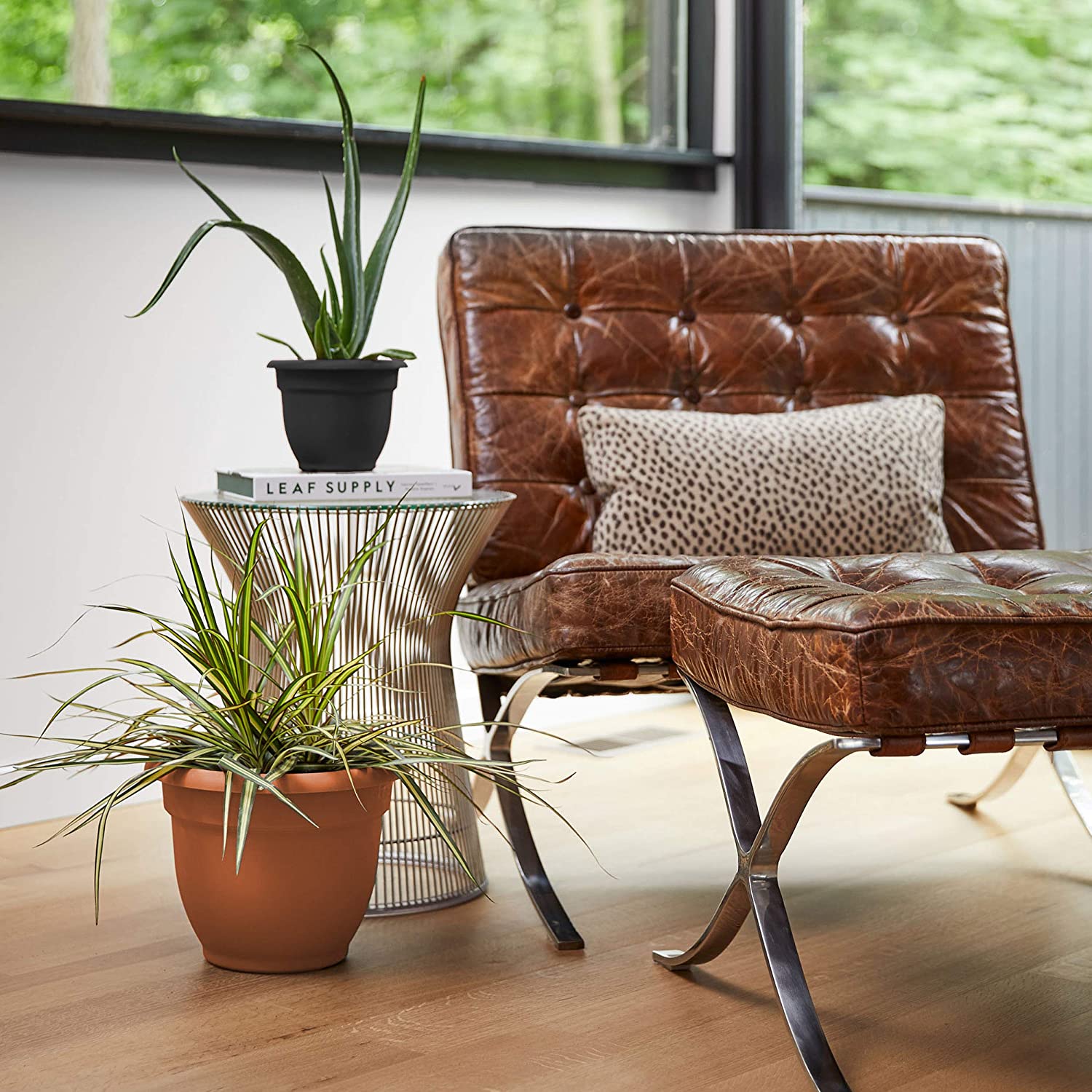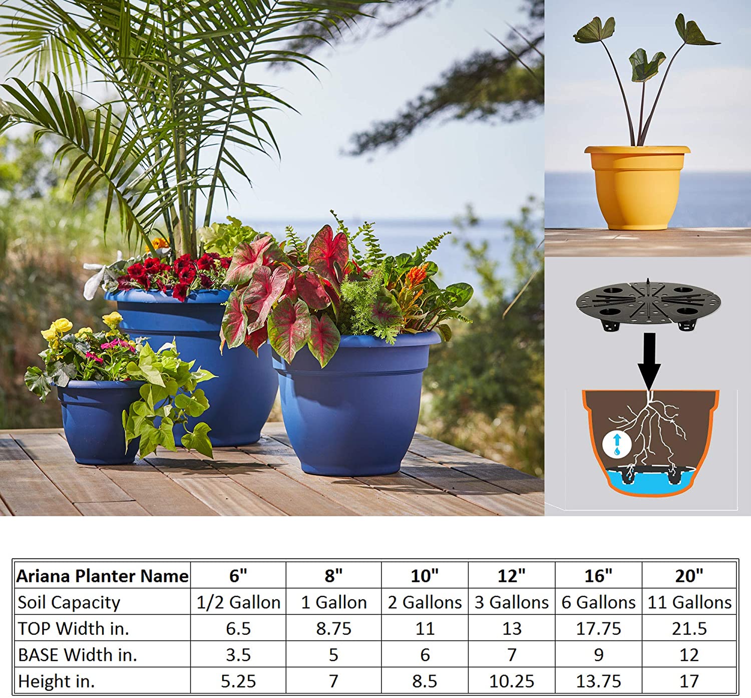 ARIANA COLLECTION by Bloem: The Ariana planter will quickly become one of your favorite pots because it helps keep your plants from drying out and will reduce the time you spend watering. Inside the planter there is a hidden reservoir located at the bottom of your pot and holds approx. 1”-3.5” (depending on planter size) of water. This self-watering insert keeps dirt and roots above the hidden reservoir while constantly providing healthy “greenhouse-like” moisture through the evaporation process. How a Self-Watering Planter Works: When big drainless pots are given more water than the plant can use right away, the water settles to the bottom and the potting mix begins to rot, eventually becoming a stinky, waterlogged mess that will kill plant roots. But inside Bloem's self-watering planter, the potting mix is held above the water line by a sturdy screen. The water chamber is connected by small porous channel filled with soil, which then acts as a wick. As water is used by the plant or evaporates from the surface of the soil, capillary action draws more water up from below. The soil has just the right amount of water all the time, but also maintains air pockets, which the plant roots need to stay healthy. Save you time by reducing watering frequency and provides a consistent water supply that helps plants thrive Perfect solution for going on vacation and busy schedules Potting mix is held above water chamber and connected by small porous channels filled with soil which act like a water wick through the evaporation process Top width 6.5" (x) base width 3.5" (x) 5.25" height Matte finish is perfect for resisting scratches, dirt, and fingerprints 100% UV stabilized polypropylene plastic ensures long lasting color and withstands extreme weather conditions + BPA free When to add drainage holes? While various kinds of plants have different drainage needs, few can tolerate sitting in stagnate water for extended periods of time. If exposed to intense periods of rainfall or storms, your soil may not be able to absorb or evaporate the water fast enough. When the pot is in an unsheltered location we recommend punching out drainage holes. The process is extremely quick and easy with the right tools. Flip pot upside down and locate areas marked “X” for recommended hole locations. Then punch out holes by using either a drill with a drill bit or a hammer and a nail. The process should only take a minute or two, then the pot will be ready to fill with potting soil and plants of your choice.