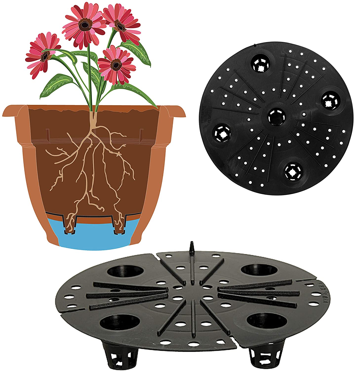 • Potting mix is held above water chamber and connected by small porous channels filled with soil which act like a water wick through the evaporation process