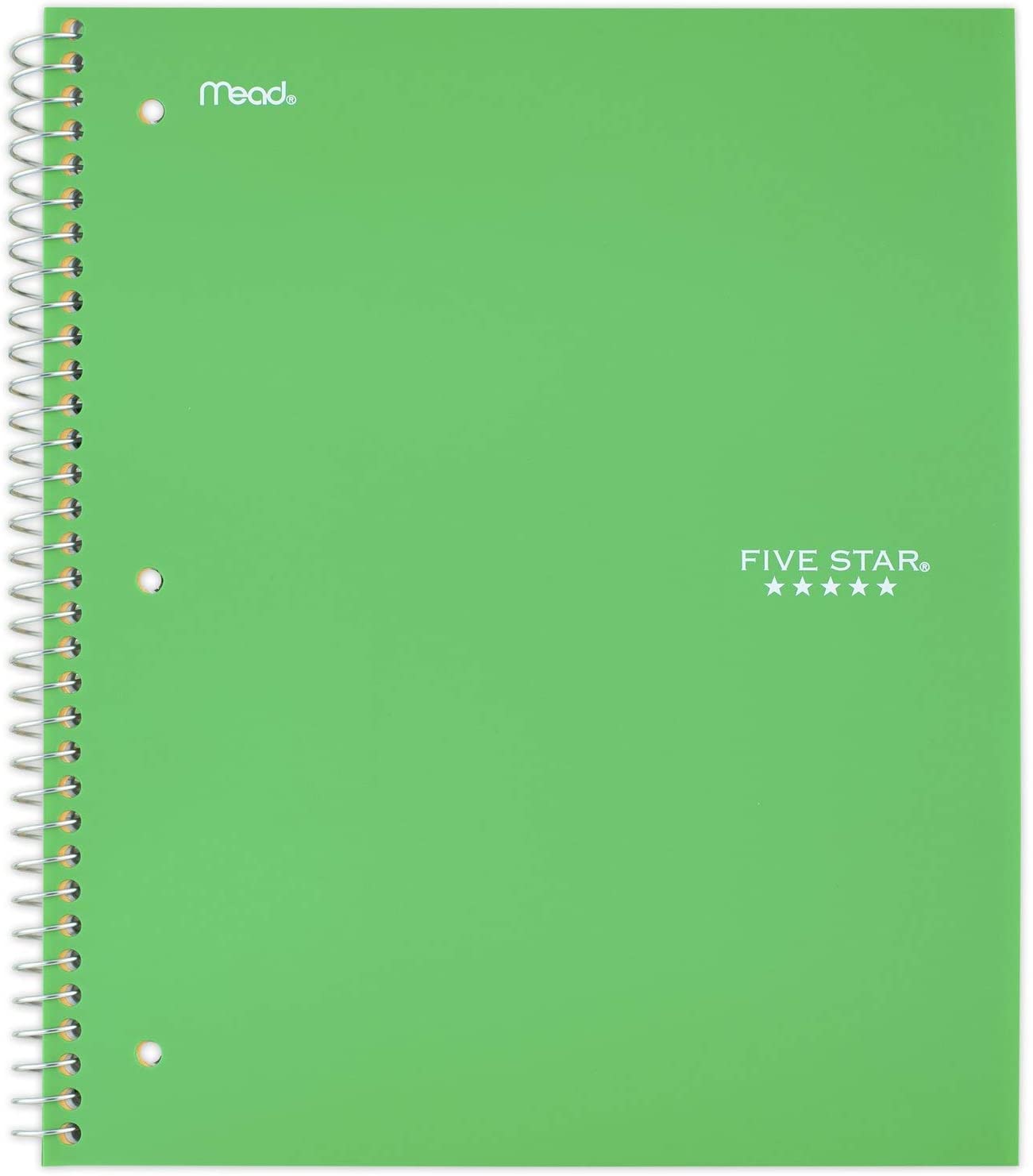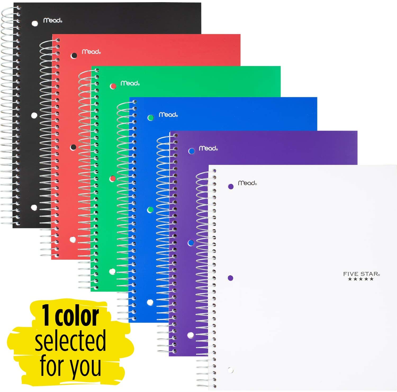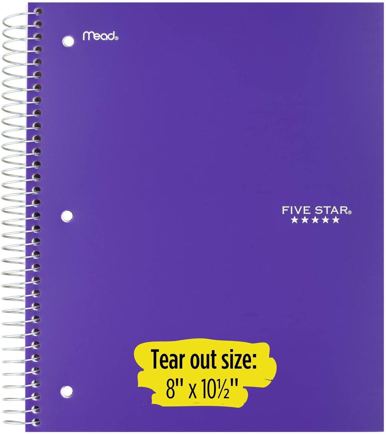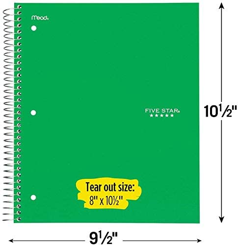 LASTS ALL YEAR. GUARANTEED!* Five Star 3 subject notebook has 150 double-sided, wide ruled pages, which are ink bleed resistant.** Pocket page divider is reinforced to help prevent tearing.*** Neat Sheet perforated pages let you tear out sheets. Spiral Lock wire binding prevents coil snags. 10-1/2" x 8" torn out page size. 10-1/2" x 8-5/8" overall size. Available in assorted colors including Black, Red, Cobalt, Electric Green, White and Royal Purple. *ACCO Brands will replace any Five Star notebook that is returned within one year from the date of purchase. This guarantee does not cover damage due to abuse. Contact ACCO Brands Consumer Affairs for instructions.**Under normal usage, paper resists ink bleed with common student writing instruments such as pencils, ball point pens, gel pens, felt tip pens and highlighters.***Based on independent laboratory test results that establish pocket tear strength as compared to non-reinforced pocket in Five Star notebook. NOTE: COLOR CHOICE IS NOT AVAILABLE FOR THIS ITEM, COLOR SHIPPED TO YOU IS SELECTED AT RANDOM, AND WILL VARY.