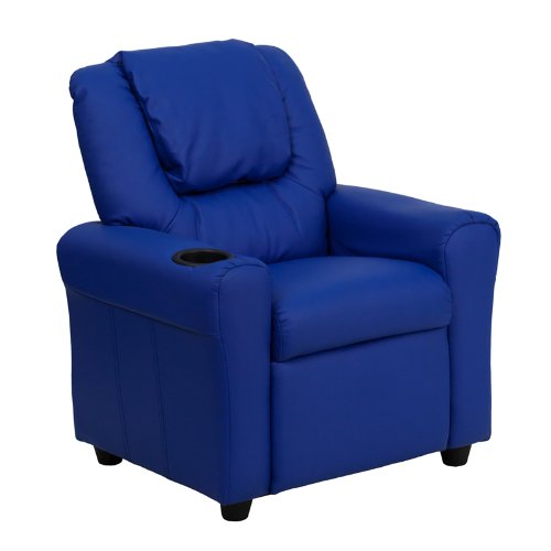 Kids will now be able to enjoy the comfort that adults experience with a recliner that was made just for them!The chair features an oversized headrest, plush upholstery and a cup holder in the arm to rest their drink during their favorite show or while reading a book. This sturdy little recliner has a solid hardwood frame and durable upholstery that cleans easily with a damp cloth. It has raised black plastic feet and will hold up to 90 pounds. Designed with safety in mind, it's filled with CA117 Fire retardant foam, and reclines only when a child is seated and the footrest is pulled out one inch.This cozy kids recliner will be a great addition to your living room or your child's bedroom or playroom.