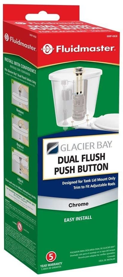 The Fluidmaster 800P-48GB Replacement Dual Flush Buttons for Glacier Bay is an exact replacement to restore Glacier Bay Dual Flush Toilets to original factory performance. Built for ease of use and durability this design features fast and simple installation with included instructions. The button rods are adjustable and can be trimmed to fit different tank heights. Glacier Bay Dual Flush gives you the power to use less or more water per flush and this replacement part is built to restore that original flush performance. For use in tank lid mount models only. Quickly fix your broken push button toilet, while upgrading your bathroom look with this shiny chrome finish genuine replacement part.