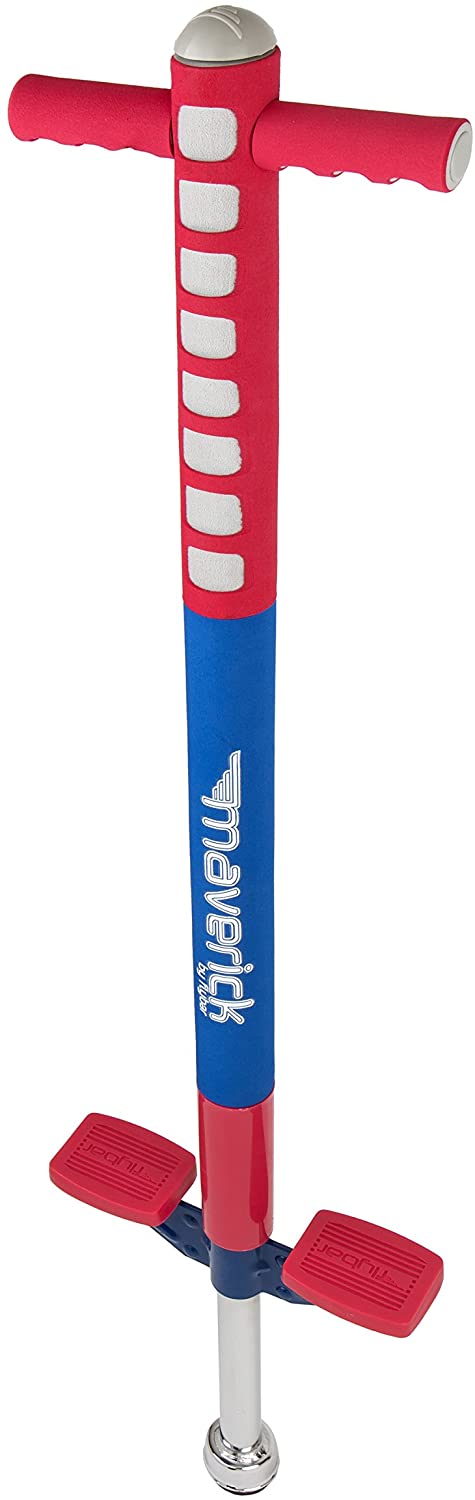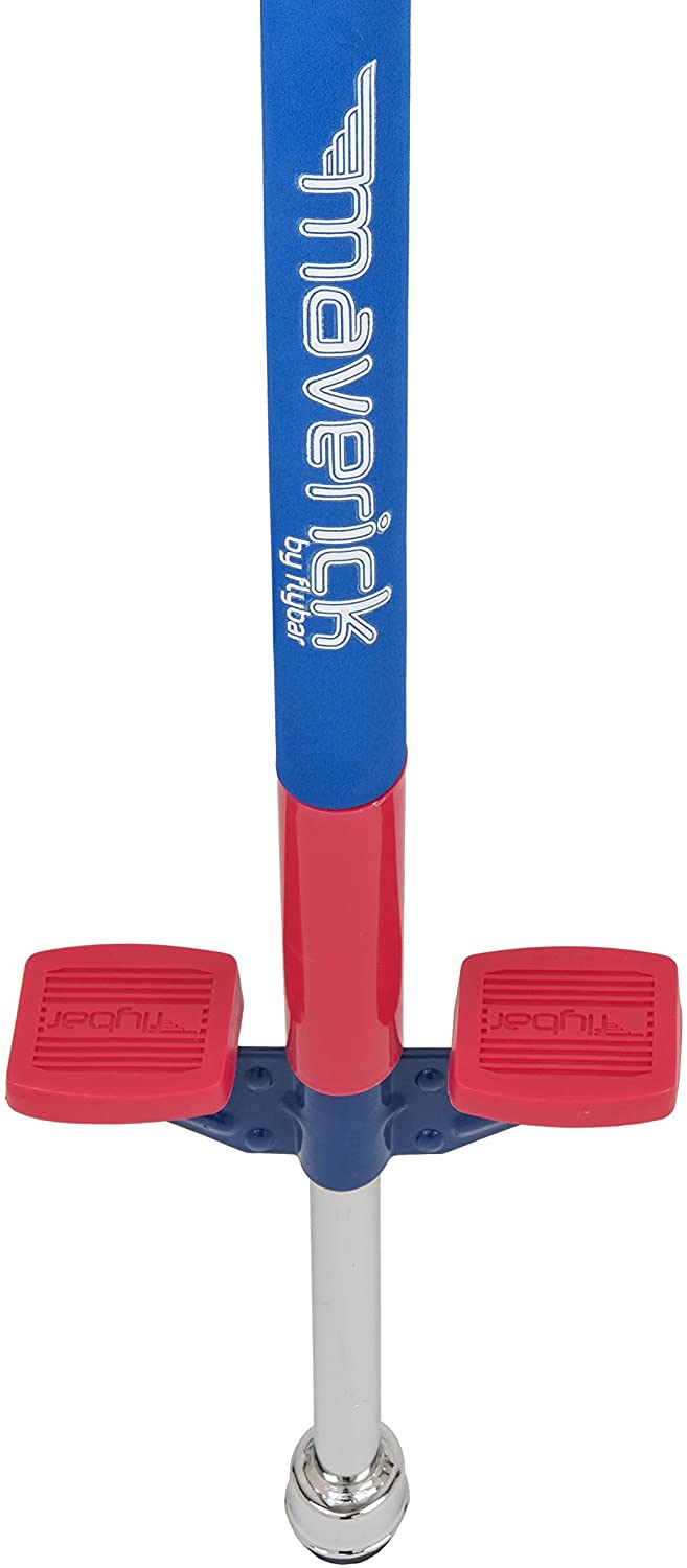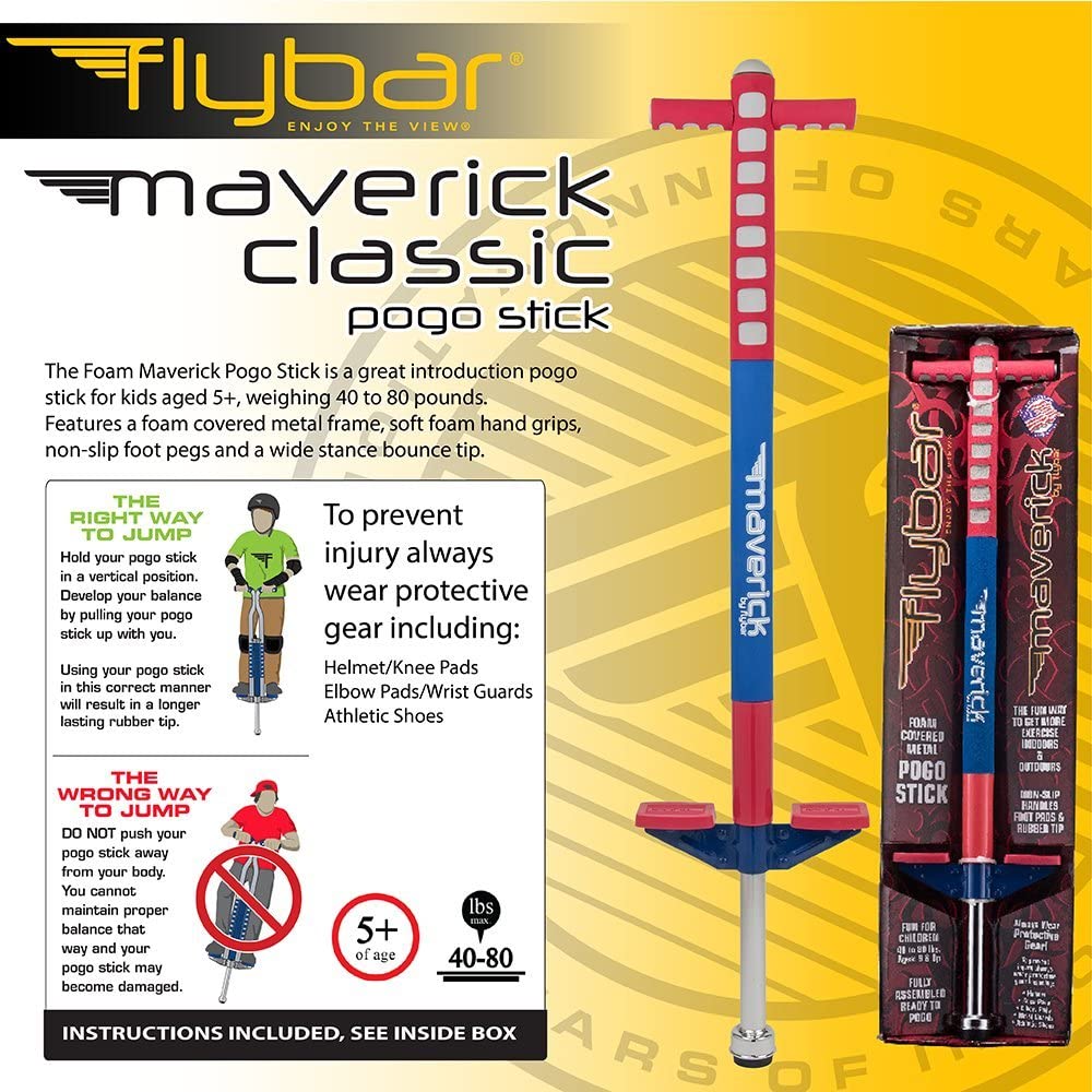 Flybar Maverick Pogo Stick Offering a great introduction to pogo stick jumping, the Flybar Maverick junior pogo stick is ideal for the young beginner. The Maverick boasts a rugged metal frame covered with foam. As a result, it is sturdy yet safe, a must for kids who are just learning the ropes. The Maverick's precision design also includes extra-wide and deep footpads, along with easy-grip handles and a rubber tip to help the rider stay in control. Designed for children between the ages of 5 and 9 years old, the Maverick support 40 to 80 pounds and comes fully assembled.