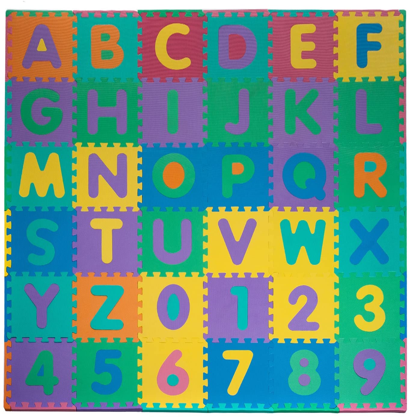 96 PC Foam Floor Alpha/Numeric Puzzle Mat For Kids Let your children learn numbers and letters through play with the Trademark Foam Floor Alphabet & Number Puzzle Mat. which features 36 colorful 12" x 12" foam tiles, including 26 pop-out letters and 10 pop-out numbers. The versatile tiles interlock, allowing flat or three-dimensional building fun and the 0.25" thick foam provides a safe and soft play surface for both indoor and outdoor fun. Product Dimensions: 72.5" x 72.5" x .25".