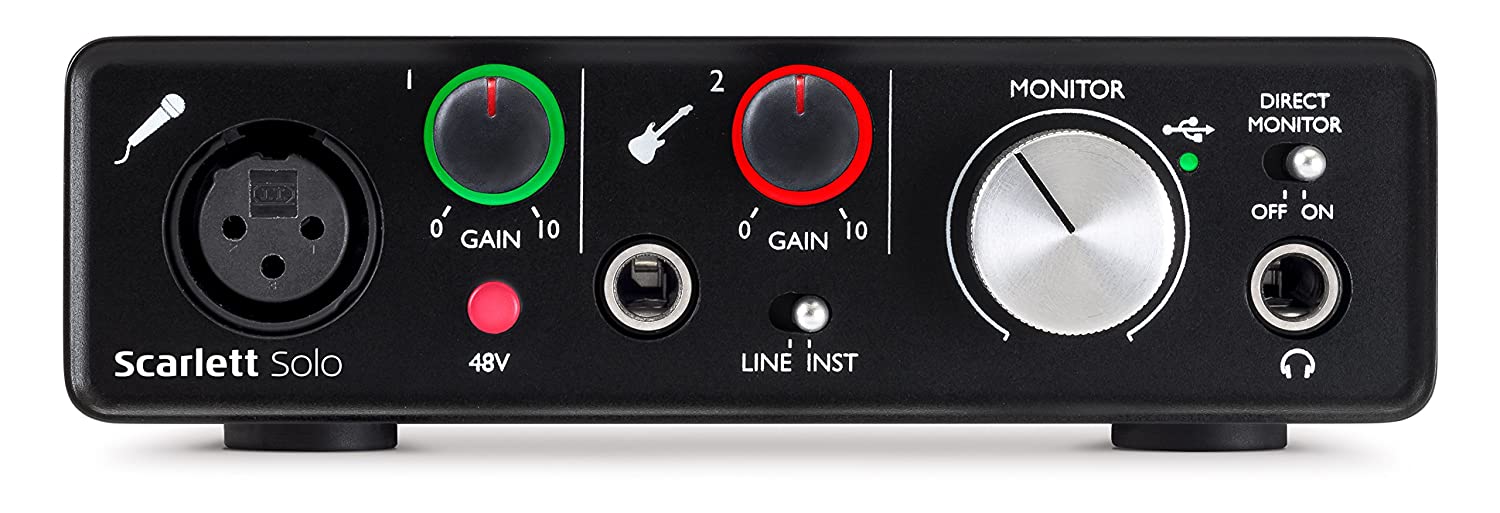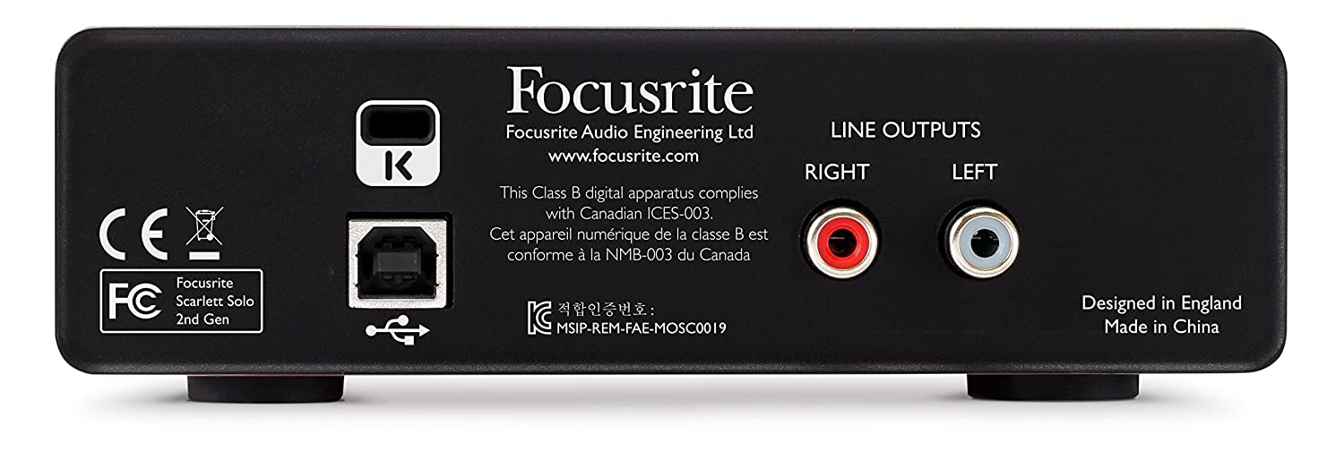 One natural-sounding Scarlett mic preamp with plenty of even gain; one instrument input, stereo line outputs on RCA phono for connecting to home speakers; one headphones output with gain control. You don't need a power supply, either - just connect with a USB cable and start recording