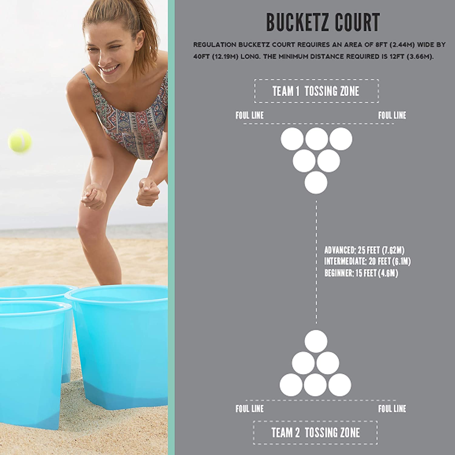 - Includes: (6) blue buckets, (6) yellow buckets, (3) tennis balls, and a convenient carry bag to transport and store your buckets game in when not in Use.