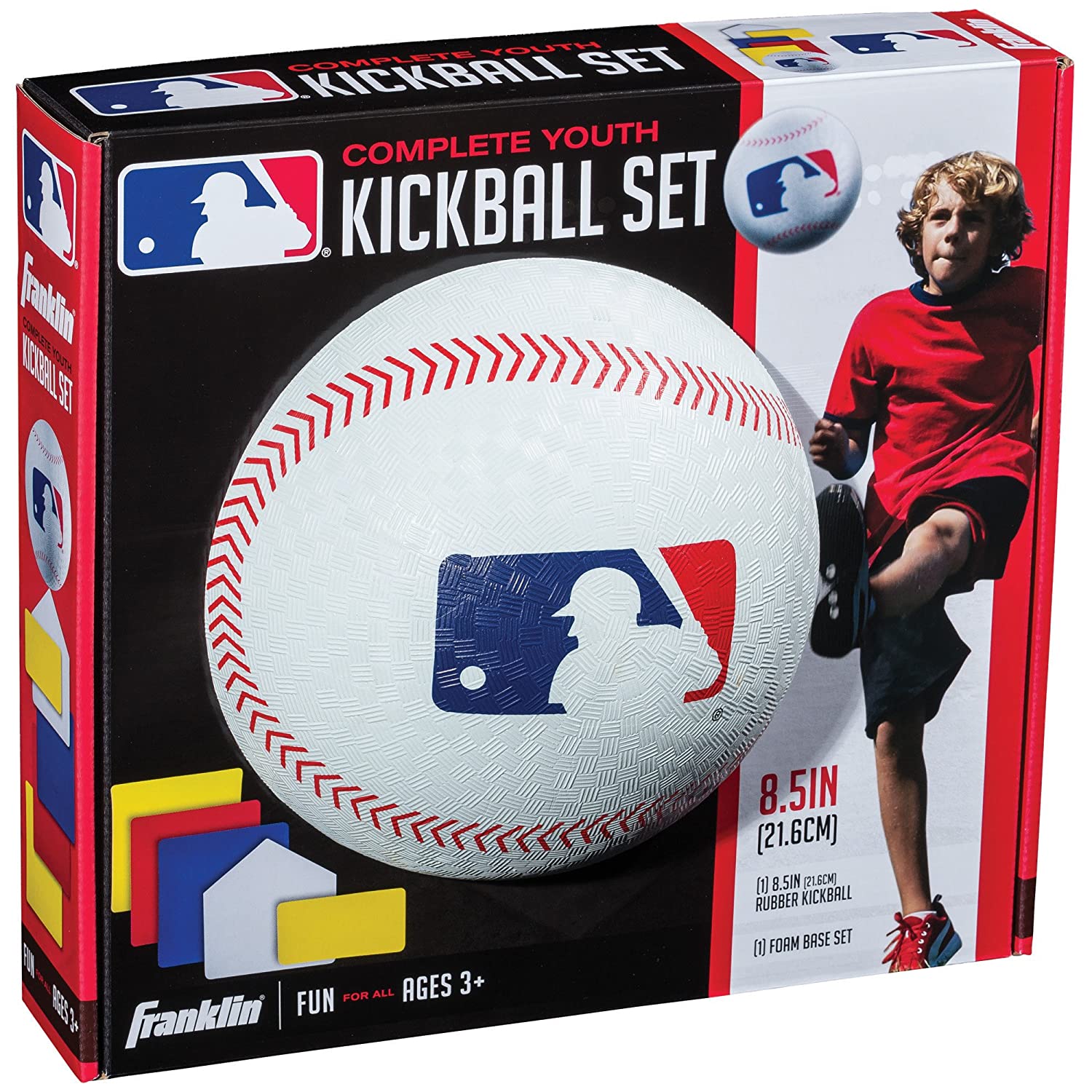 Perfect for outdoor play with family and friends, the Franklin youth kickball set is designed for safe, easy and quick set up and instant fun. The set includes all bases plus a pitching mound. You decide how Big the field should be based on the ages of the kids who play. The set includes a soft inflatable rubber molded 8.5 inch kickball and light-weight, colored EVA bases. Enjoy a fun game of kickball at birthdays, cookouts, at the Park or out on the beach.
