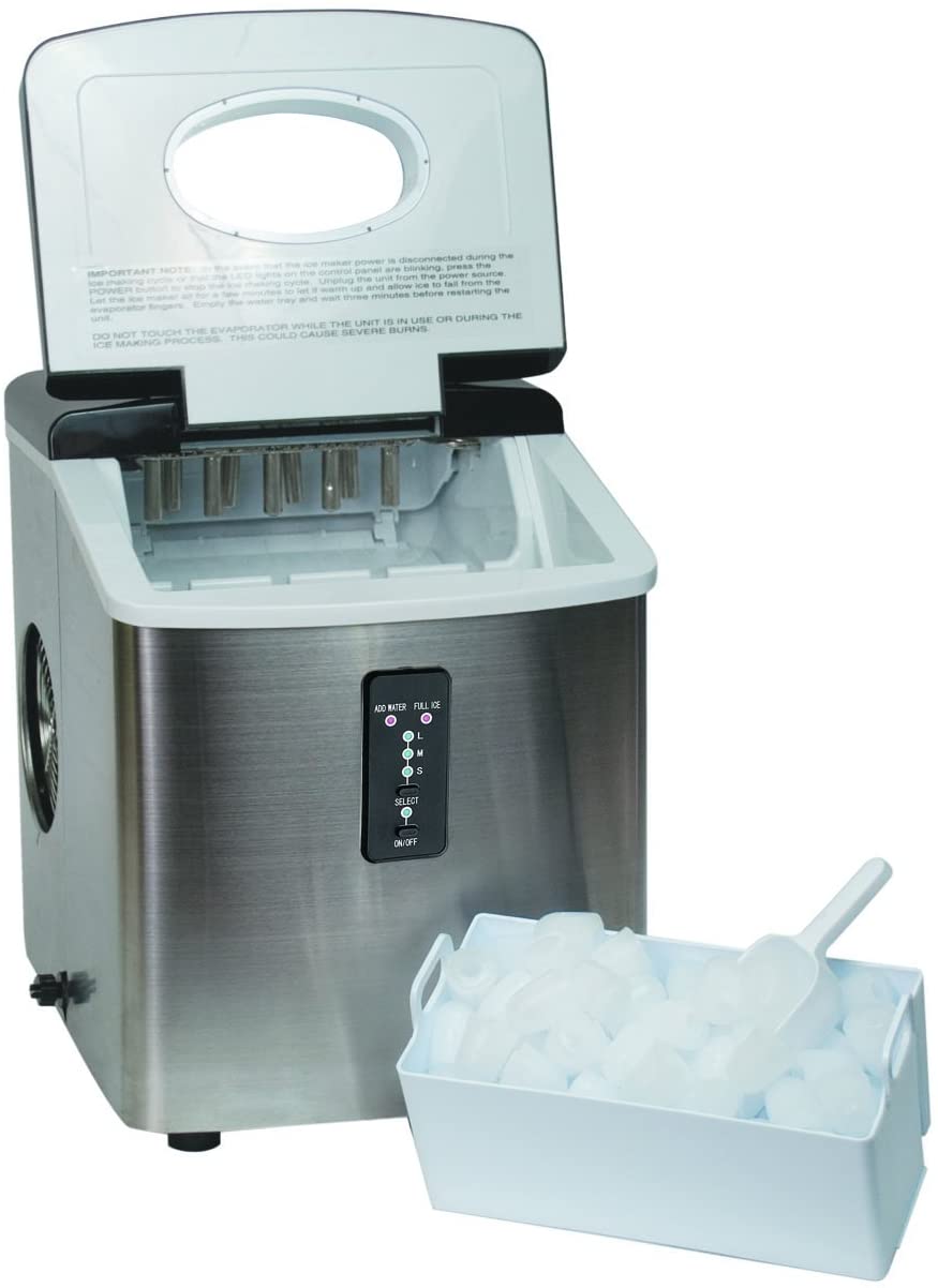 Portable Stainless Steel Ice Maker Over-sized Ice bucket holds 2.2 lbs of ice Choice of 3 Ice Cube Sizes (small, medium and large) Enjoy a batch of ice in as little as 6 minutes Produces 26 lbs of ice per day
