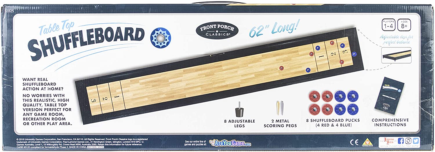 Can’t slip out to play Shuffleboard at a real pub? No worries! Front Porch Classics brings pub-style shuffleboard home with this realistic, high quality, wooden table top version. Perfect for any game or recreation room. Game board measures 62” x 10” x 1.5”. For 1 to 4 players, ages 8 years and up.