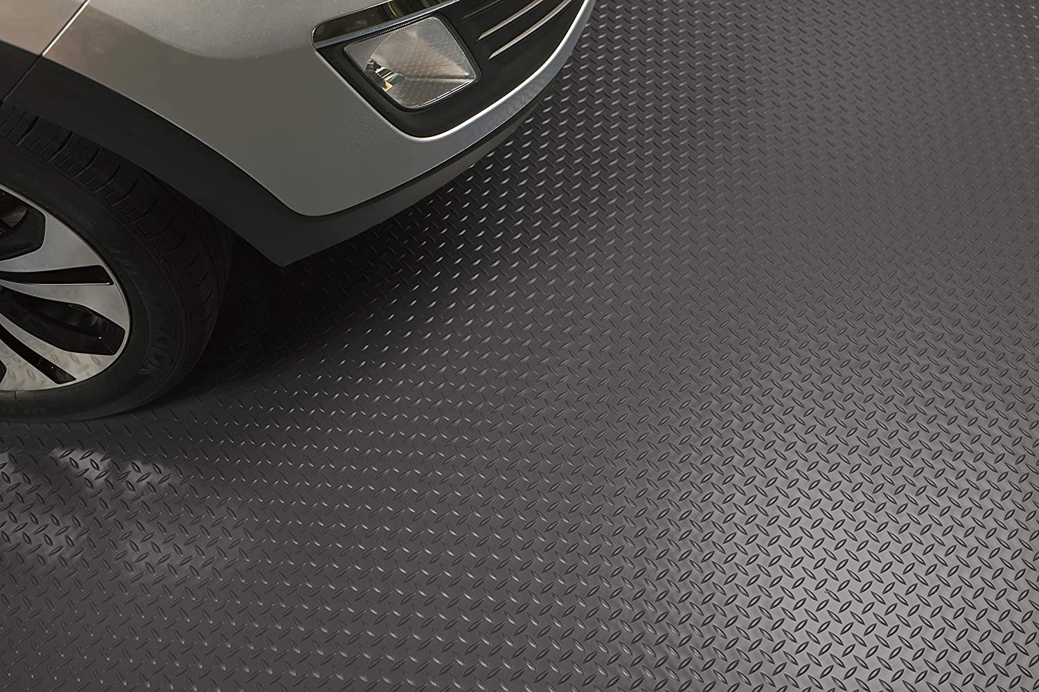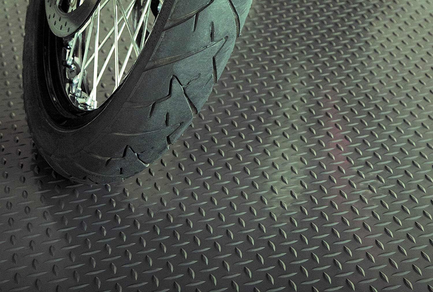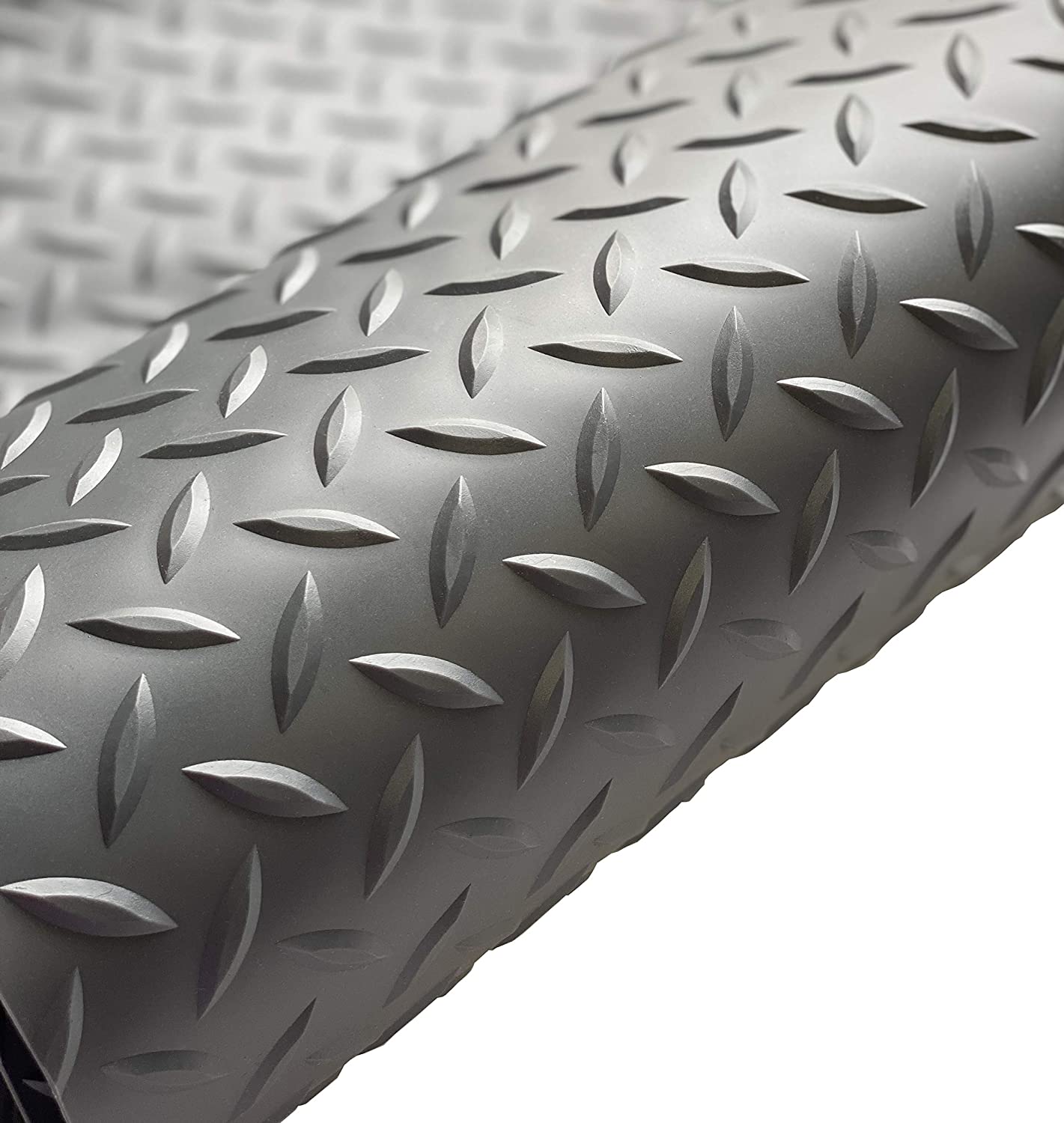 The rugged diamond garage floor mat from G-Floor is manufactured in the USA by Better Life Technology. This high quality PVC garage floor covering is also widely used on commercial and industrial floors as well as a trailer floor covering. The diamond pattern is a customer favorite because of its amazing appearance. While no garage flooring product is stain proof, we have found that gray and black hold up better to vehicular use. The manufacturer also offers a stain blocking top coat. The BLT garage floor mat is designed to protect the garage floor from harsh automotive chemicals, liquids and debris. This product is in new condition and is stored flat until the time you place your order. The product is then rolled and smaller rolls are shipped via FedEx ground while larger rolls ship on a freight truck and will require the customer to be home and assist with unloading. This garage floor mat can be used in wall to wall applications or as a parking pad under individual vehicles.