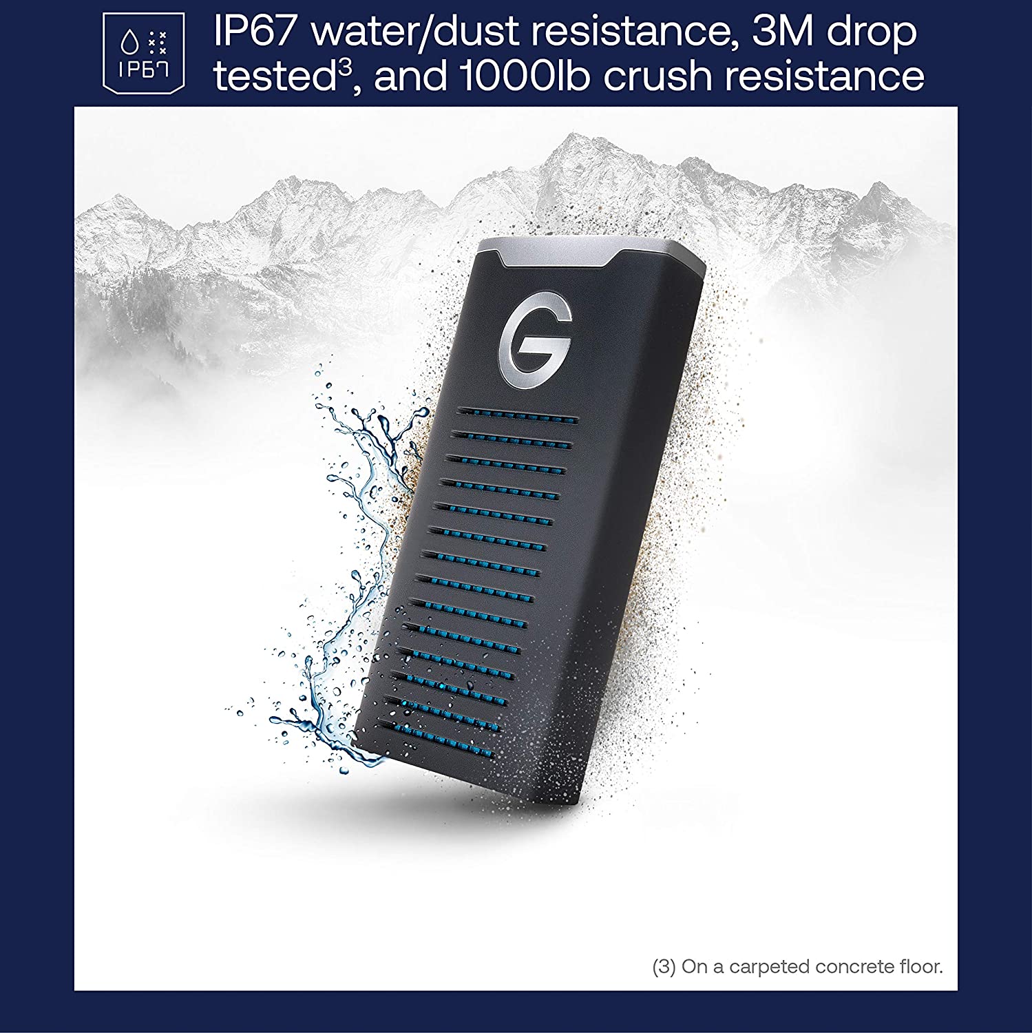 Featuring IP67 water-and dust-resistance, 3-meter drop protection*, and a 1000lb crushproof rating, the G-DRIVE mobile SSD provides durable storage you can trust. Transfer speeds up to 560MB/s** let you quickly save, edit and archive large source files, while a versatile USB-C port with a USB 3.1 Gen 2 interface keeps this device ready for laptops both old and new. With the G-DRIVE mobile SSD, you get exceptionally durable storage to handle your big picture. | *on a carpeted concrete floor | **As used for transfer rate, megabyte per second (MB/s) = one million bytes per second. Performance will vary depending on your hardware and software components and configurations.