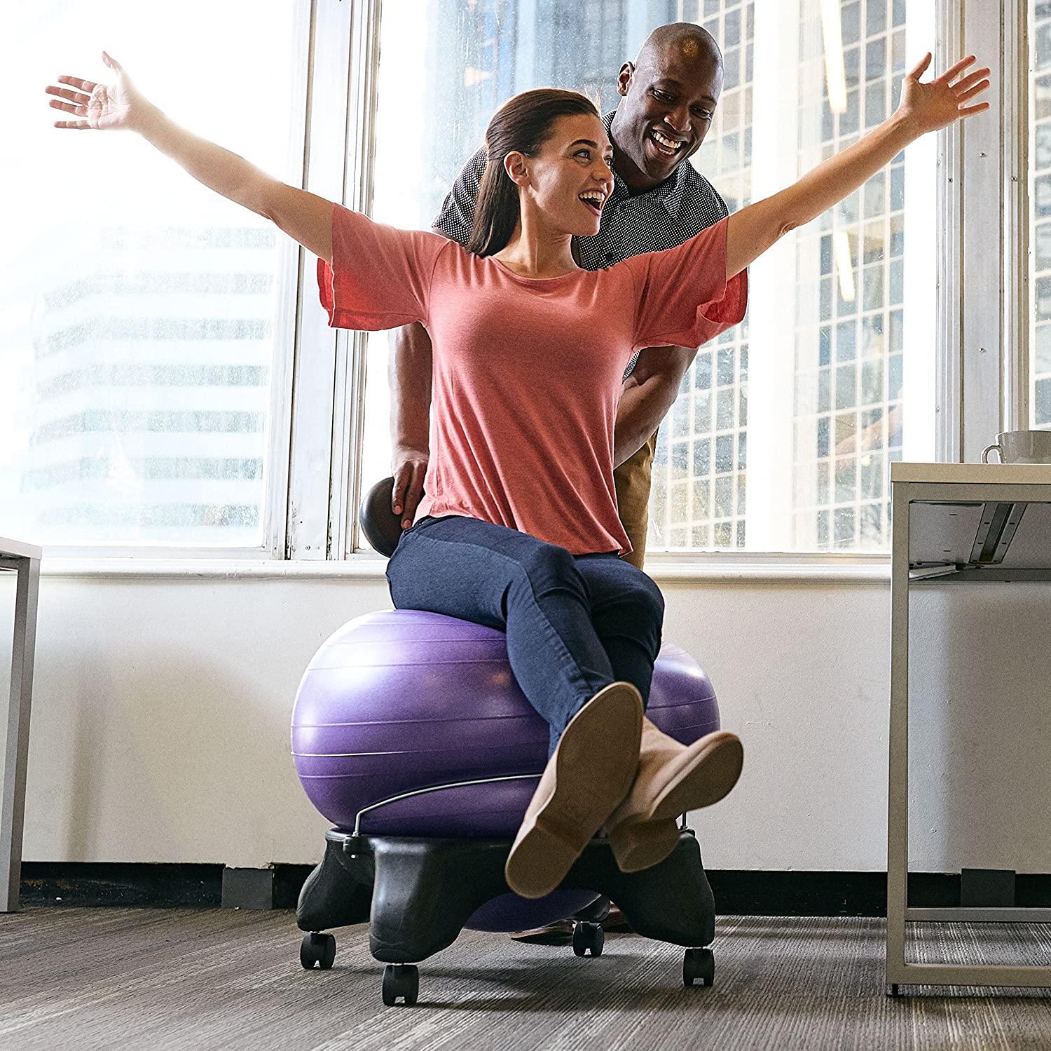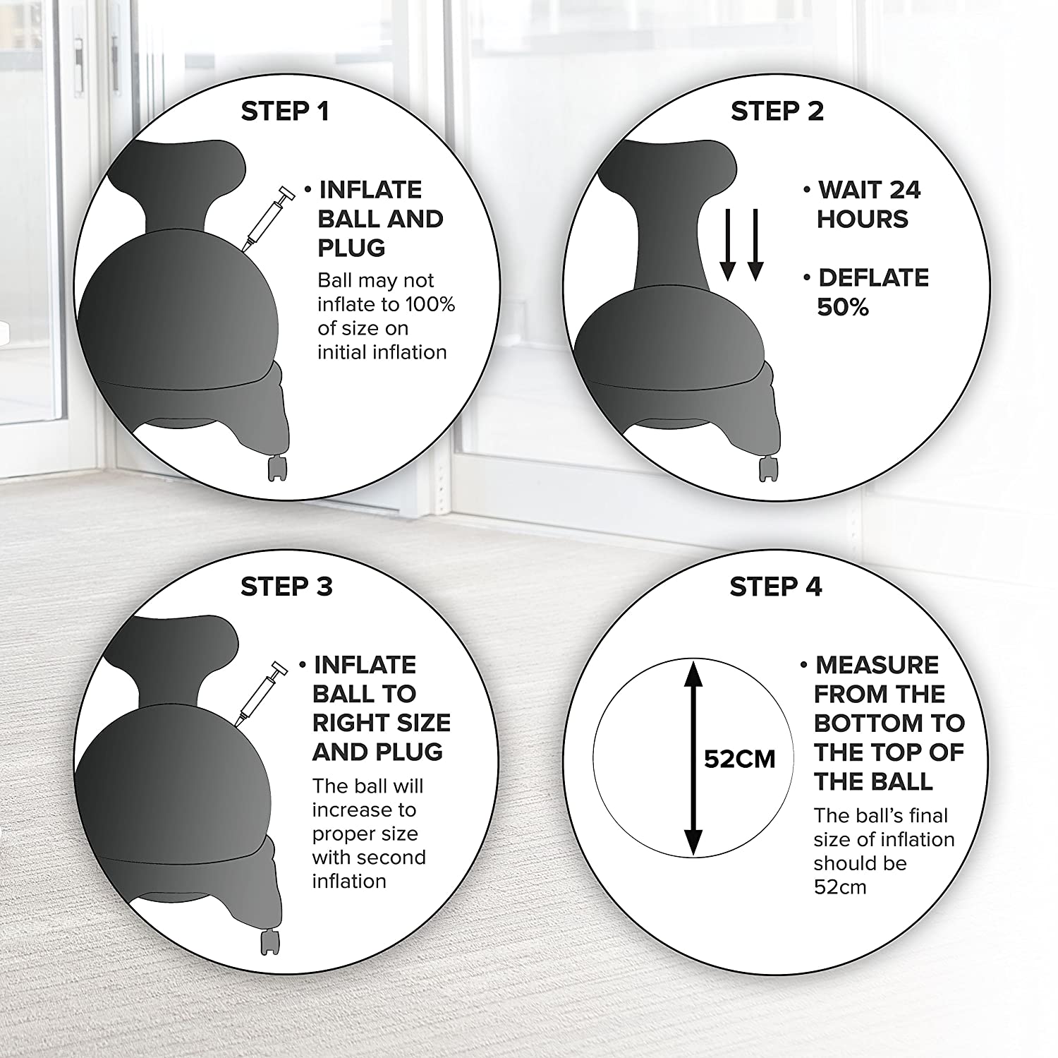 This revolutionary desk chair will change the way you sit. Designed with a work-life balance in mind, the Gaiam Balance Ball Chair, created with the help of chiropractic pioneer Dr. Randy Weinzoft, provides the all-day ergonomic support needed while sitting for long duration. Feel better at your workplace by utilizing this alternative chair solution that encourages wellness and helps to soothe the aches and pains that come from sitting at a desk for extended periods of time. By promoting micro movements and constant stimulation of the body, the mind will experience a heightened sense of focus and concentration. This unique office desk chair is designed for users between 5' - 5'11" and fits most standard size desks. For users that may require a little extra boost, the Gaiam Leg Extenders add 2 inches of height to your chair. Please note that for the ball to fit perfectly in the base, it may be necessary to re-inflate the ball once or twice after initial inflation.