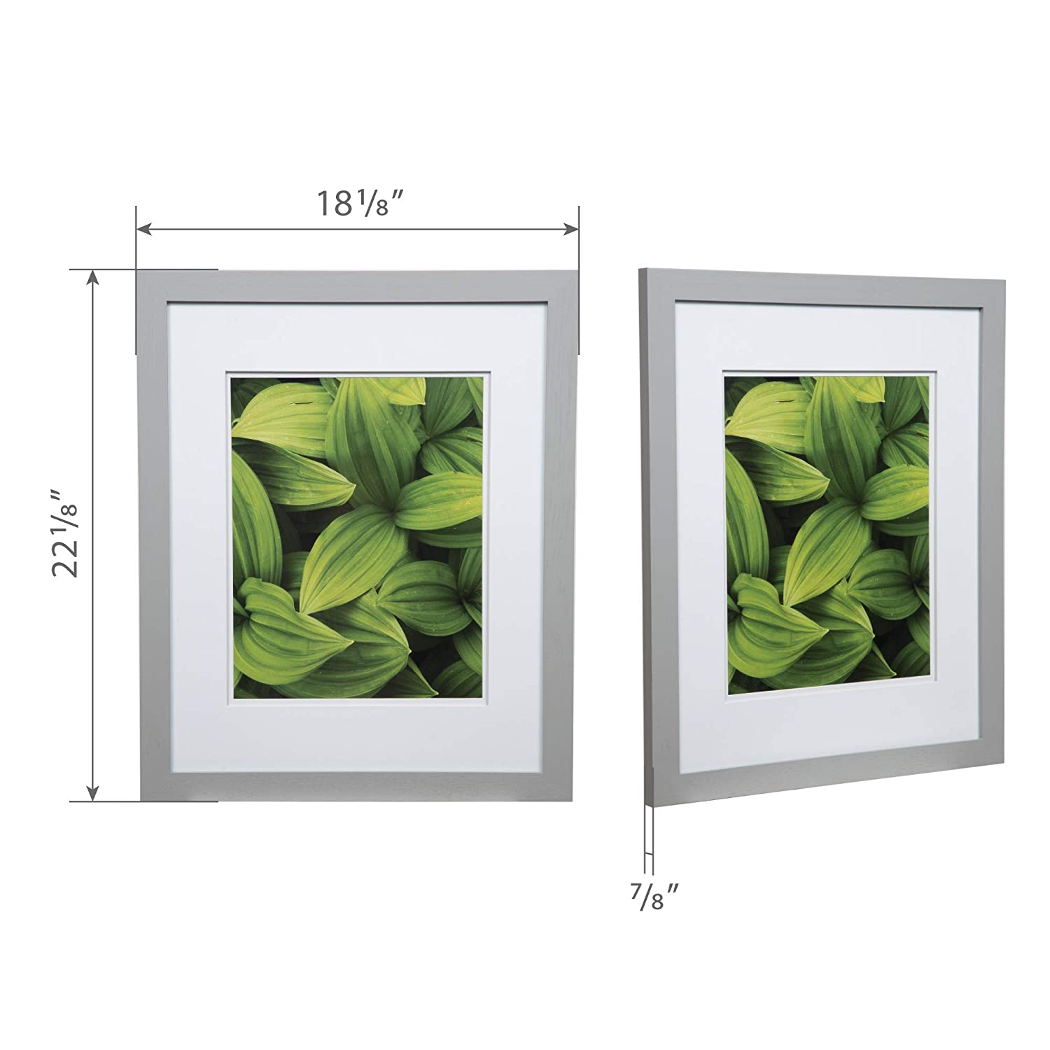 Our Gallery Solutions Gray solid wood wall frame holds an 11 inch x 14 inch image with black Airfloat mat and measures 14 inches x 18 inches without the mat.