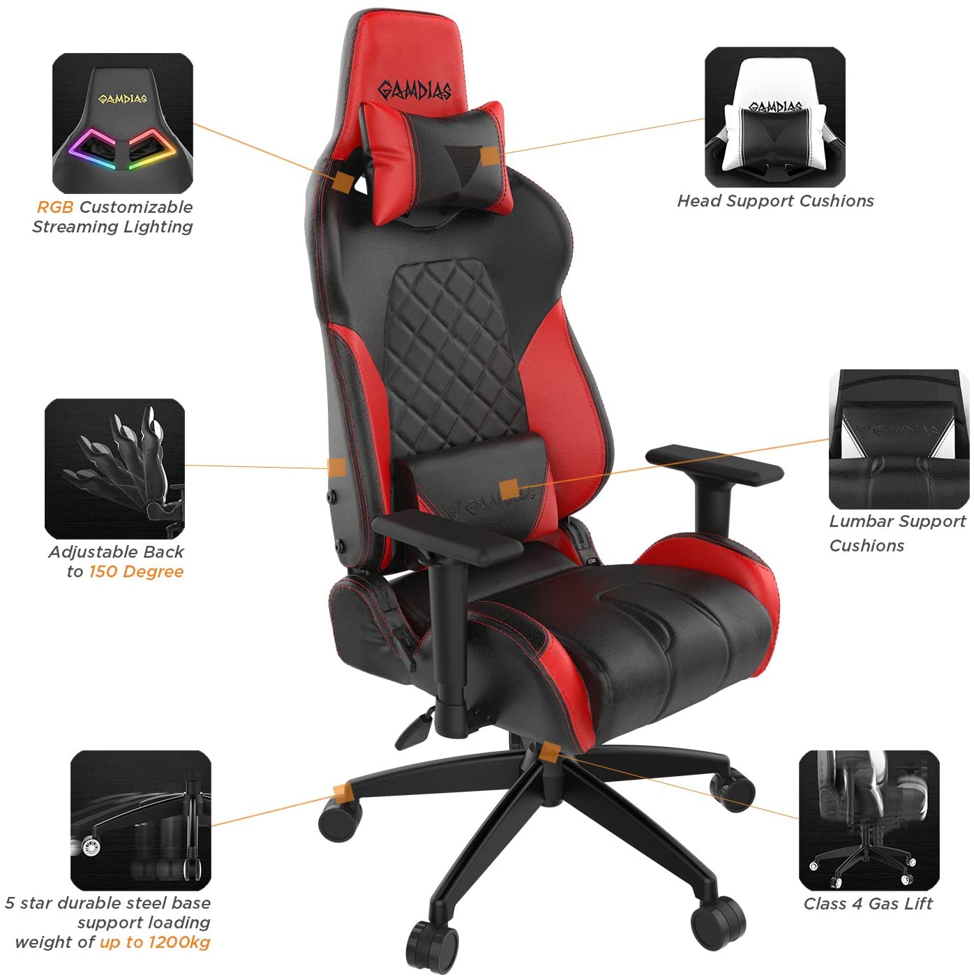 Customizable RGB Back Light , Up to 10 lighting effect options High Resilience Foam Filling, Ensures that the chair doesn't get deform. Advanced Leather Style Vinyl which is soft, breathable and resistant to sweating 2D-Direction Adjustable armrest protect shoulders and wrists Customizable Comfort - with adjustable back angle, customizable seat height, accessible tilt locking and adjusting mechanism Adjustable height Class 4 Hydraulic Pistons Stability - Sturdy 5 star aluminum alloy base support loading weight of up to 1200kg.