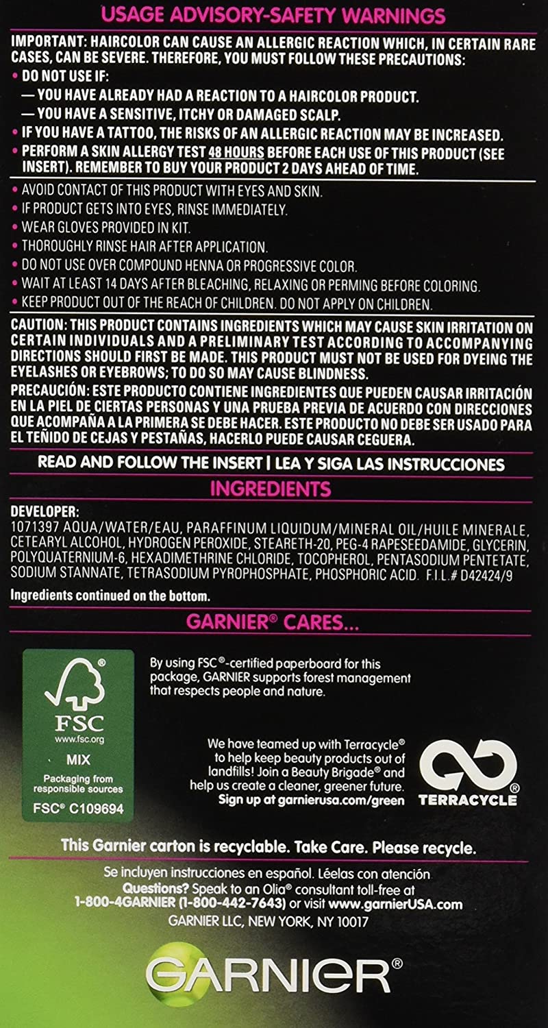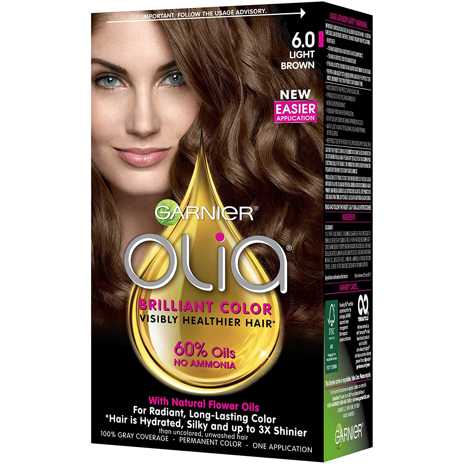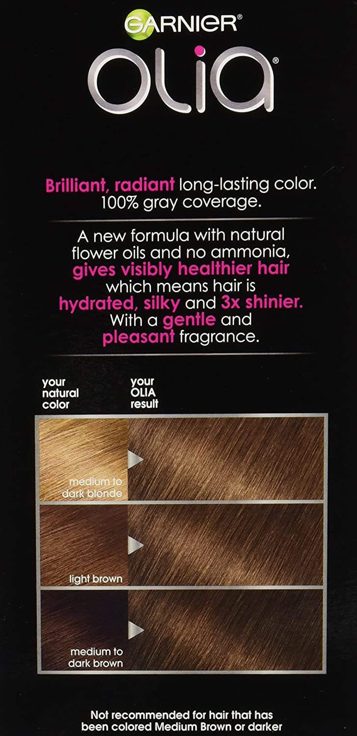Garnier Olia Hair Color is an ammonia free hair color that uses an exclusive 60% oil blend with natural flower oils to achieve brilliant, radiant color results. The unique non-drip velvet cream formula propels colorants into the hair--without ammonia--with a pleasant sensorial fragrance. Garnier Olia Hair Color visibly improves and restores hair as the oils help to reverse roughness and dullness for more brilliant, long-lasting color. Hair is hydrated, silky, 3x shinier and visibly healthier (than uncolored, unwashed hair) . Hair Color Kit contains easy applicator bottle with developer, colorant tube, after color conditioner, gloves and instructional insert.