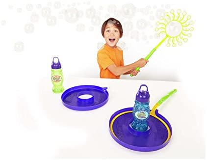 • INCLUDES TWO TRAYS AND TWO BOTTLES OF GAZILLION BUBBLE SOLUTION: Each wand comes with its own tray and 16 ounce bottle of Gazillion giant bubble solution that creates non toxic Bubbles. No bubble mix needed.