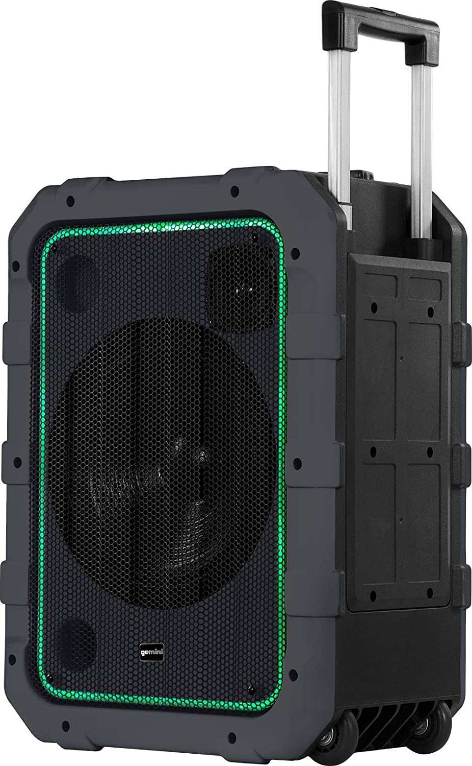 Gemini MPA-2400 10” Rechargeable Weather-Resistant Trolley Speaker with Bluetooth, LED Light Show, 6 DSP Modes, Microphone and Guitar Inputs, 240W Peak Power, FM Radio