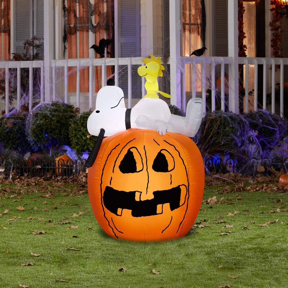 Greet your guests with this adorable Airblown inflatable decoration. Snoopy and Woodstock sit on top of a pumpkin for this fun Halloween scene. It comes with everything needed for easy outdoor setup. Just plug it in, stake it down and watch the magic unfold.