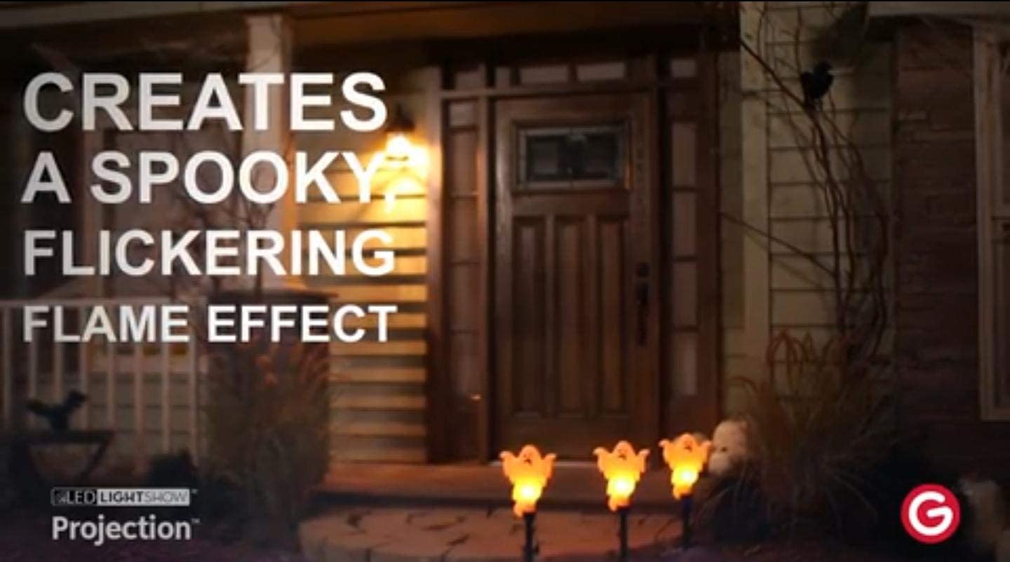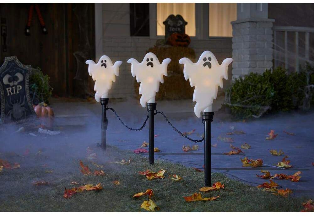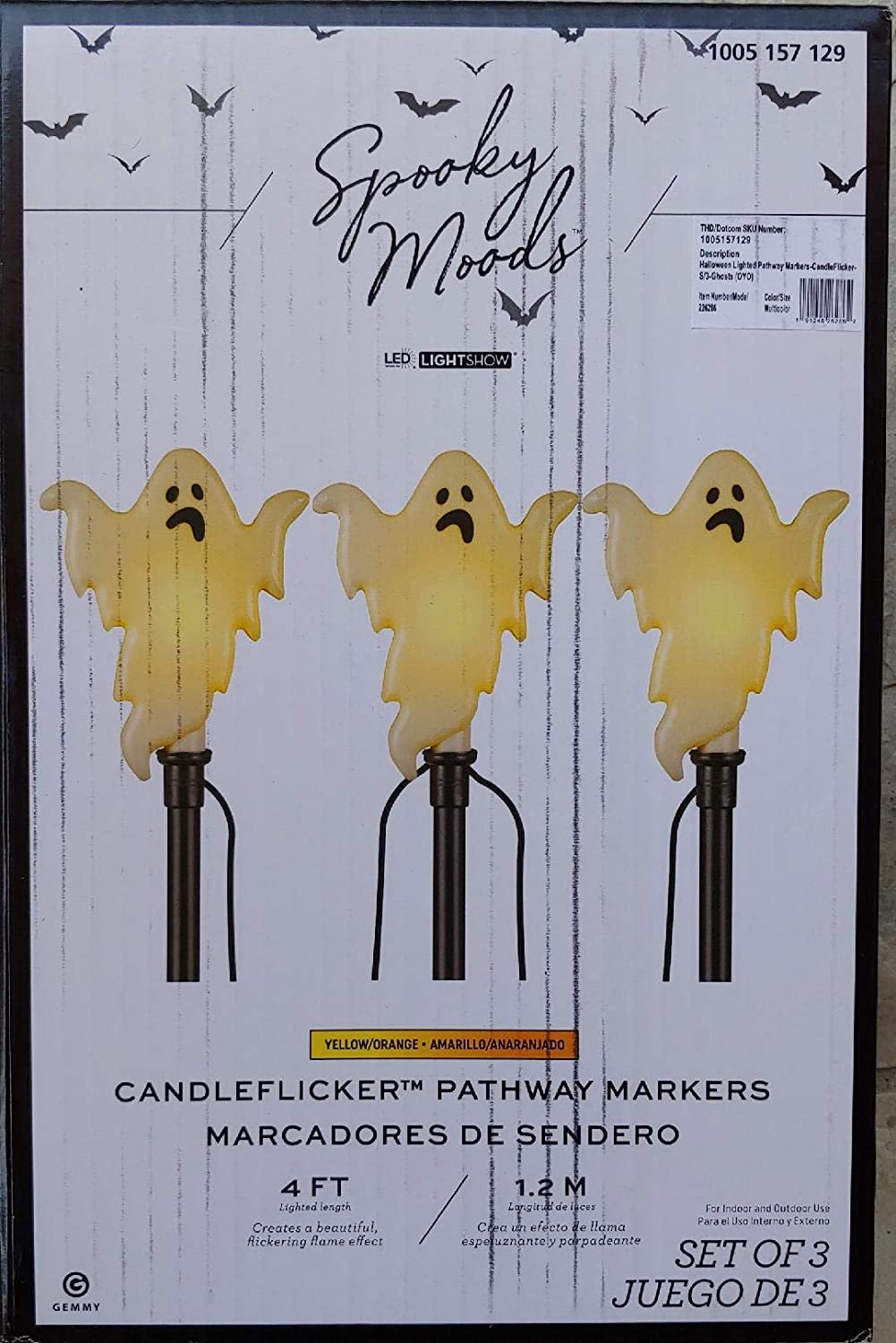 Featuring spooky, flickering flame this set of Candle Flicker Ghost Pathway Markers are made to illuminate your yard or walkway. You can collect multiple sets for a dramatic effect. These ghosts stake easily into the ground and use LED energy efficient lights to glow. Set of 3 pathway makers Features a spooky, flickering flame effect Lights up with bright, energy-efficient LEDs Decorative ghost stakes Connect multiple sets end-to-end Lighted Length 4' Feet (Total Length 5' Feet)