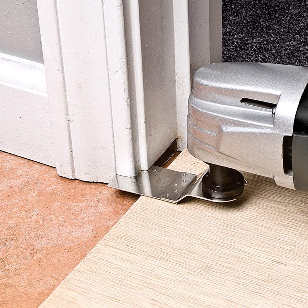 To make cut-outs in wood, plastic, or drywall, you'll want to use the 3-inch flat saw blade. The rigid scraper blade makes pulling up old vinyl flooring or carpeting no problem. The scraper also comes in handy for chipping away at stubborn paint layers.